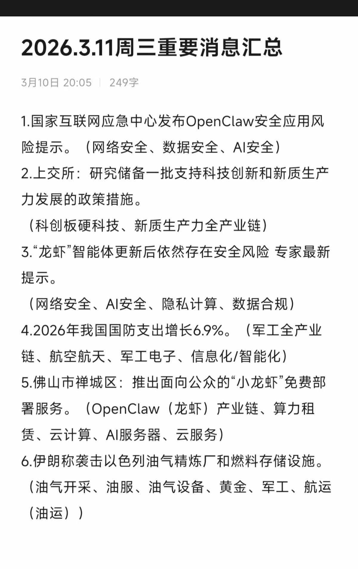 3.11周三 最新:财经热点资讯汇总! 1.OpenClaw安全应用风险提示 2.养龙虾,补贴 3.英伟达推出最新一款AI代理平台 4.SpaceX,AI编程 5.军工电子,AI服务器