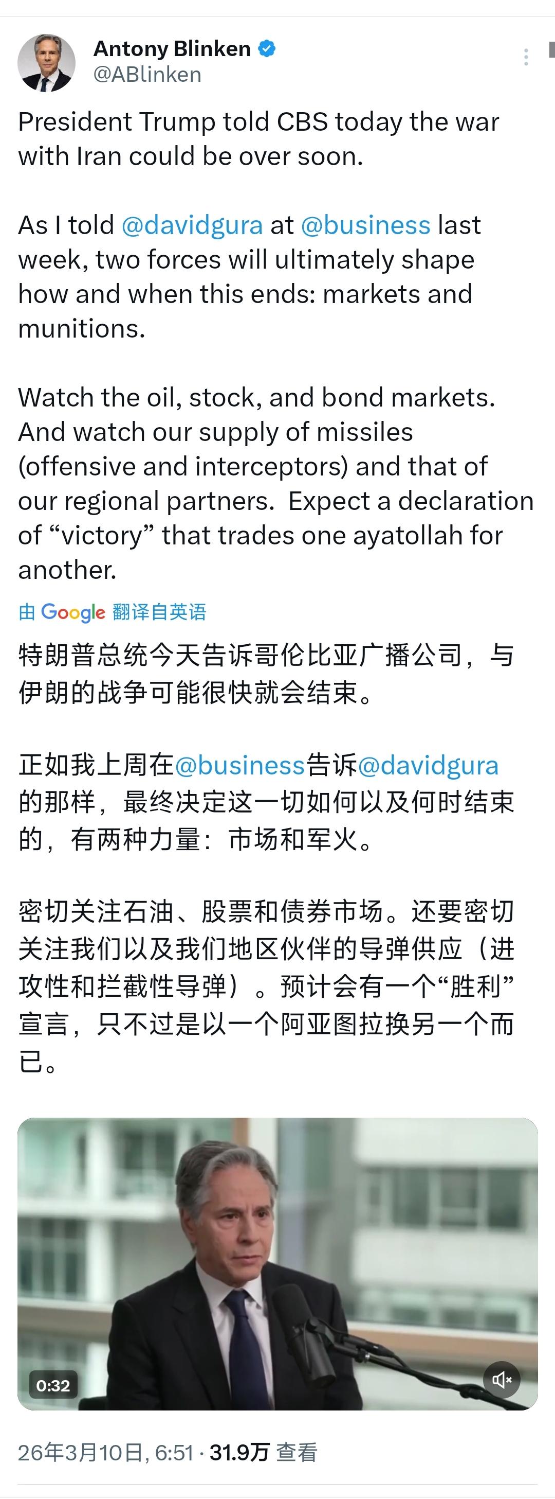 美国前国务卿布林肯今天(北京时间3月10日)写道:“特朗普总统今天告诉哥伦比亚广播公司,与伊朗的战争可能很快就会结束。正如我上周在彭博社商业频道告诉David Gura的那样,最终决定这一切如何以及何时结束的,有两种力量:市场和军火。 密切关注石油,股票和债券市场。还要密切关注我们以及我们地区伙伴的导弹供应(进攻性和拦截性导弹)。预计会有一个‘胜利’宣言,只不过是以一个阿亚图拉换另一个而已。” [机智]评几句:目前看来,布林肯预测成功。特朗普果然宣布了“胜利”,但并非真正的胜利,这场所谓的胜利不过是美国霸权在中东棋局里的自欺欺人,是市场压力与军火利益裹挟下的政治表演。布林肯点破的市场与军火两大核心,恰是这场闹剧的底层逻辑:油价狂飙击穿美国民众通胀承受底线,中期选举的政治焦虑逼着特朗普匆匆喊停,而军工巨头早已借着导弹攻防的消耗赚得盆满钵满,所谓的胜利不过是为资本牟利披上的外衣。特朗普口中的战事结束,既压不住霍尔木兹海峡的通航危机,也挡不住伊朗的报复回击,其吹嘘的战果更被伊朗戳穿为谎言。以一个阿亚图拉换另一个阿亚图拉,以一个哈梅内伊换另一个哈梅内伊,肯定不是美国的胜利。