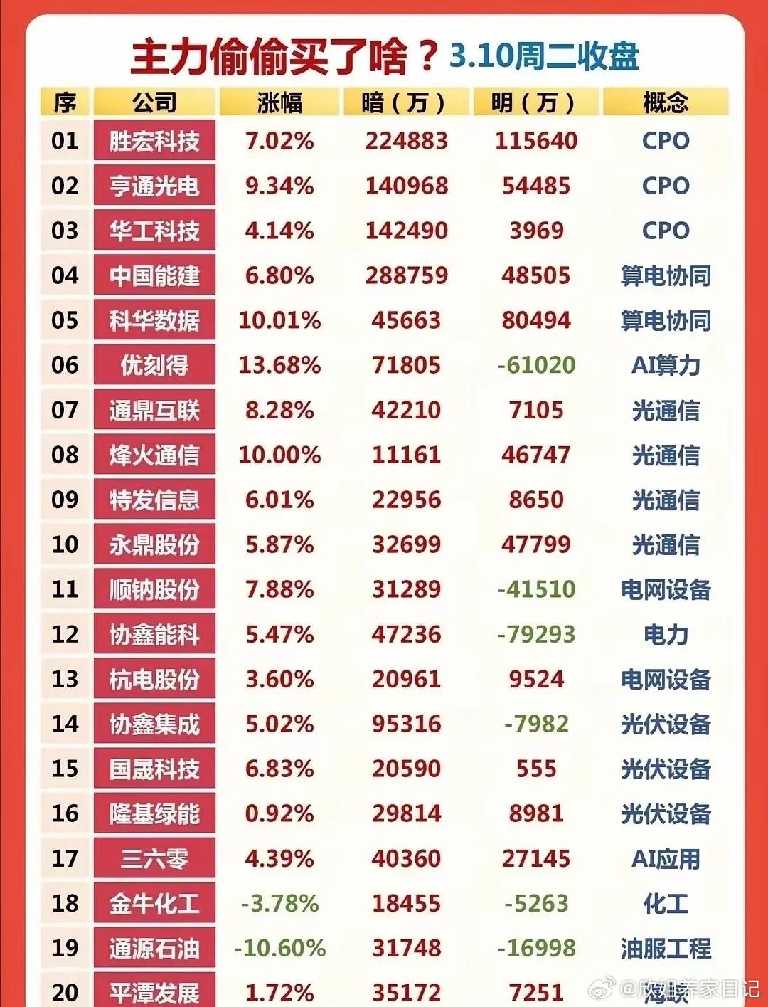 今日硬科技赛道成核心主战场,CPO、光通信、算电协同是主力重点布局方向,三大板块个股获大额暗资金流入;AI算力、电网设备等方向资金出现分歧,光伏设备板块内部分化;油服工程、化工等传统板块资金明显撤离,市场资金向高景气赛道集中,题材炒作热度降温。个股梳理分析1、胜宏科技(CPO):当日涨幅7.02%,暗资金流入224883万,明资金115640万。CPO主线核心标的,主力资金大幅进场,板块热度持续,资金承接力强,短期或延续强势走势。2、亨通光电(CPO):涨幅9.34%,暗资金140968万,明资金54485万。CPO光模块龙头,暗资金流入规模居前,光通信产业链景气度提升,资金看好其后续业绩增长。3、华工科技(CPO):涨幅4.14%,暗资金142490万,明资金3969万。CPO概念标的,暗资金流入显著,光模块业务订单充足,短期受板块带动或保持震荡上行态势。4、中国能建(算电协同):涨幅6.80%,暗资金288759万,明资金48505万。算电协同核心标的,暗资金流入规模大,基建+能源协同业务推进,基本面稳健获资金认可。5、科华数据(算电协同):涨幅10.01%,暗资金45663万,明资金80494万。算电协同方向强势标的,明资金流入超暗资金,算力配套业务需求增长,资金做多意愿浓厚。6、优刻得(AI算力):涨幅13.68%,暗资金71805万,明资金-61020万。AI算力概念标的,暗资金流入但明资金大幅流出,算力板块短期分歧明显,资金兑现意愿较强。7、通鼎互联(光通信):涨幅8.28%,暗资金42210万,明资金7105万。光通信领域标的,暗资金流入,光纤光缆需求提升,板块联动下短期或维持震荡偏强走势。8、烽火通信(光通信):涨幅10.00%,暗资金11161万,明资金46747万。光通信龙头,明资金流入规模超暗资金,光模块业务布局完善,资金看好其行业地位。9、特发信息(光通信):涨幅6.01%,暗资金22956万,明资金8650万。光通信概念标的,暗资金流入,光通信产业链景气度延续,短期或跟随板块保持上行节奏。10、永鼎股份(光通信):涨幅5.87%,暗资金32699万,明资金47799万。光通信+超导双概念,明资金流入超暗资金,双主线支撑下资金关注度持续提升。11、顺钠股份(电网设备):涨幅7.88%,暗资金31289万,明资金-41510万。电网设备标的,暗资金流入但明资金大幅流出,电网板块资金分歧,短期或震荡整理。12、协鑫能科(电力):涨幅5.47%,暗资金47236万,明资金-79293万。电力概念标的,暗资金流入,明资金大幅流出,电力板块资金兑现意愿强,短期调整概率大。13、杭电股份(电网设备):涨幅3.60%,暗资金20961万,明资金9524万。电网设备领域标的,暗资金流入,电网投资持续推进,资金或继续关注其业务拓展。14、协鑫集成(光伏设备):涨幅5.02%,暗资金95316万,明资金-7982万。光伏设备标的,暗资金流入规模大,明资金小幅流出,光伏板块内部分化,短期或震荡调整。15、国晟科技(光伏设备):涨幅6.83%,暗资金20590万,明资金555万。光伏设备标的,暗资金流入,光伏产业链需求稳定,资金关注度一般,短期或随板块震荡。16、隆基绿能(光伏设备):涨幅0.92%,暗资金29814万,明资金8981万。光伏设备龙头,暗资金流入,明资金小幅流入,光伏行业龙头地位稳固,资金持有意愿较强。17、三六零(AI应用):涨幅4.39%,暗资金40360万,明资金27145万。AI应用核心标的,明资金流入超暗资金,AI应用场景落地加速,资金看好其业务发展潜力。18、金牛化工(化工):涨幅-3.78%,暗资金18455万,明资金-5263万。化工板块标的,暗资金流入,明资金小幅流出,化工板块资金撤离,短期或延续调整态势。19、通源石油(油服工程):涨幅-10.60%,暗资金31748万,明资金-16998万。油服工程标的,暗资金流入,明资金大幅流出,油服板块资金持续撤离,短期弱势明显。20、平潭发展(海峡):涨幅1.72%,暗资金35172万,明资金7251万。海峡概念标的,暗资金流入,明资金小幅流入,海峡题材热度一般,资金或短期持有观望。总结今日主力资金呈现高景气赛道集中特征,CPO、光通信、算电协同三大硬科技方向获主力重仓,资金流入规模与持续性均居前列;AI算力、电网设备、光伏设备等板块出现资金分歧,传统化工、油服工程板块资金持续撤离。市场资金向业绩与景气度双优的硬科技方向靠拢,题材炒作热度降温,后续资金或继续聚焦高成长赛道,传统板块难获资金青睐。