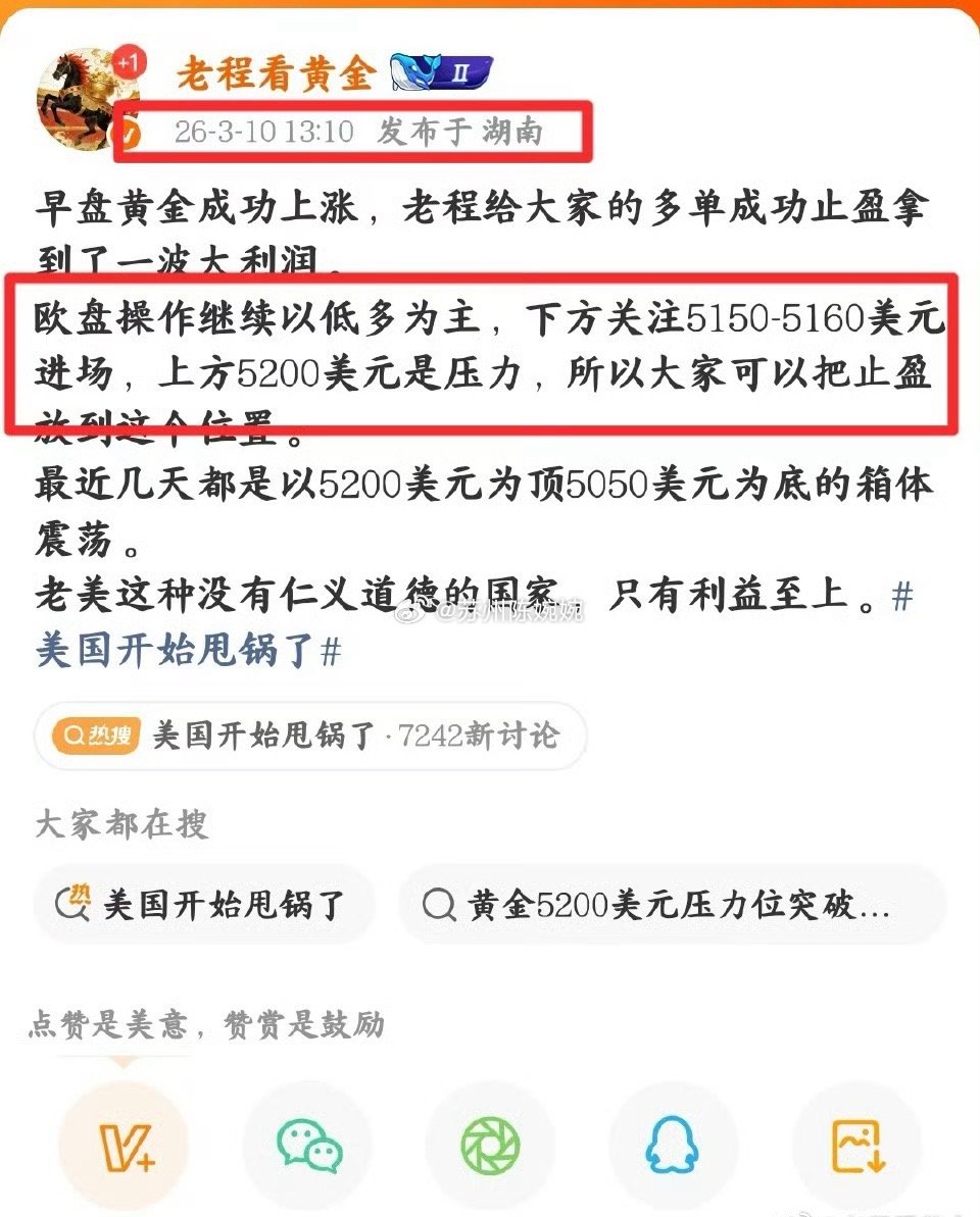 目前黄金抵达关键压力位5200美元附近,有跟上老程建议多单的朋友可以先落袋为安。等待行情做出选择我们再选择进场。早盘5130美元多,午后5150-5160美元多都是非常成功的拿下多头利润,跟上吃到肉的朋友点赞赞!老程分析今天的行情也不会太大5100-5200美元区间震荡。伊朗提出停火条件