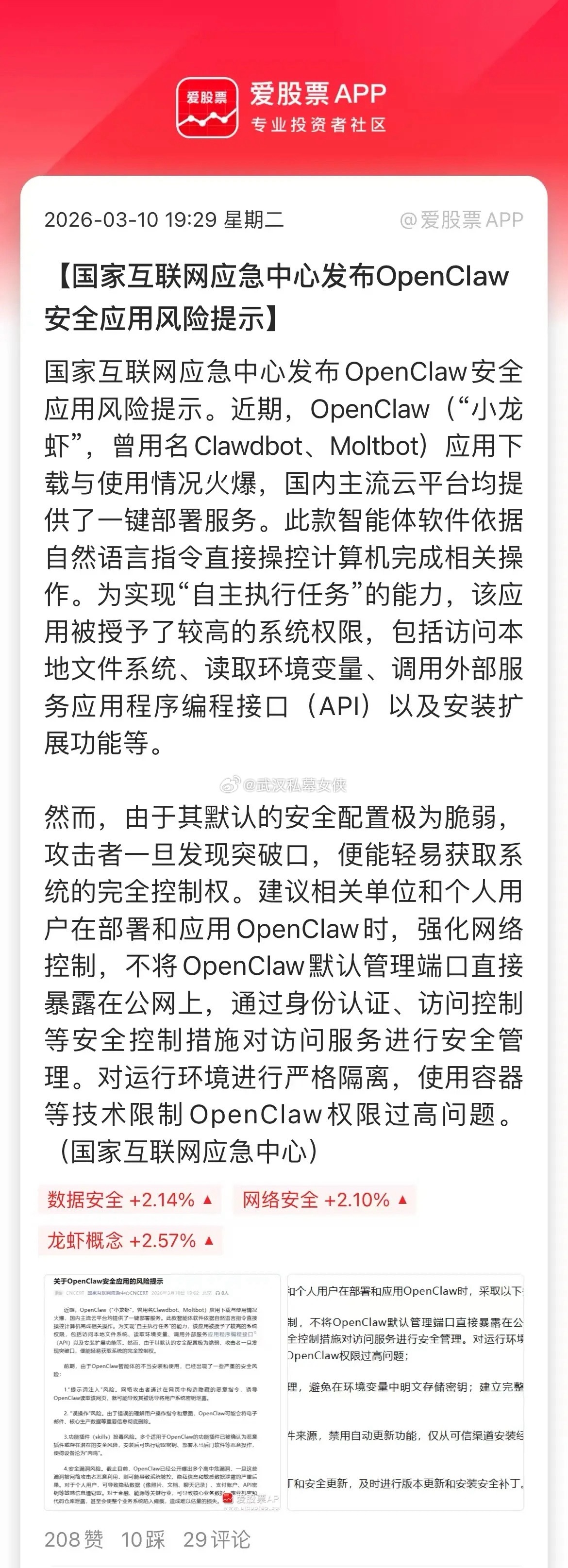 这两天“养龙虾”彻底火了,在A股港股也爆炒。大A主要是国产算力硬件,算力租赁、AI服务器、存储、CPU芯片、云计算、电网设备等全线上涨!港股今天腾讯、阿里、minimax、智谱等龙虾概念股集体暴涨!minimax上市2个半月股价涨了6.5倍,最新市值高达3800亿,超过百度和京东,这也太疯狂了。这一波的小龙虾狂热实在有点热过头了,堪比去年的deepseek。不过,目前小龙虾有两个最大的问题,第一个是花费不少,需要消耗Token;二是使用还是有一定门槛的,不是谁都玩的转。总之,养龙虾之所以很火,一方面大家比较新奇,想尝鲜一下;一方面是大家都比较焦虑,生怕被AI给淘汰,也想龙虾帮我们做一些简单的工作!但养龙虾也存在安全风险,比如泄露你的隐私,误删你的文件,甚至信用卡被盗刷的等等!从A股的角度,它承载了AI应用落地的期待,巨头+地方政府都在强力支持,炒上一波大的是可能的。短期最正宗还是云计算、算力这些方向,依然是“卖铲子”的优先,然后是AI安全、AI+行业等方向!但这个到底能不能普及,其实还不大好说!因为还需要对于龙虾能力的不断发掘,不过A股先炒了再说,要信就先信,要么就不信。
