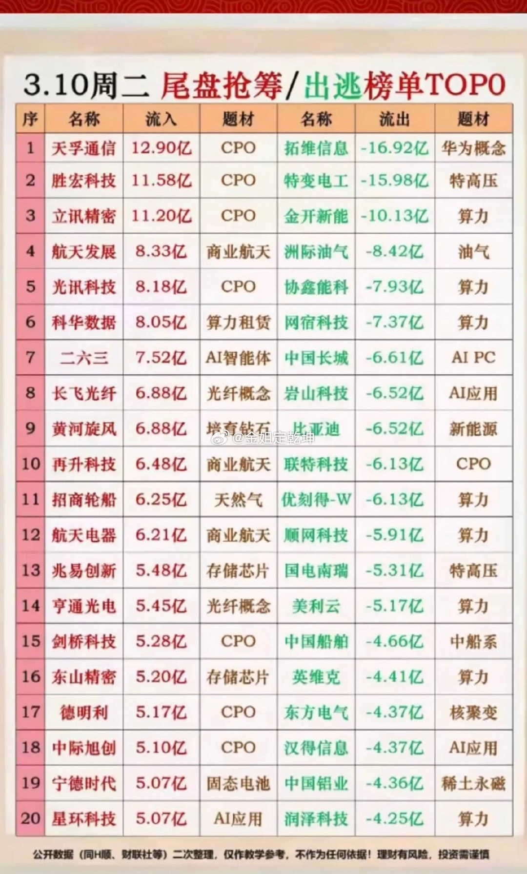3.10周二 尾盘资金 抢筹/出逃 个股榜!