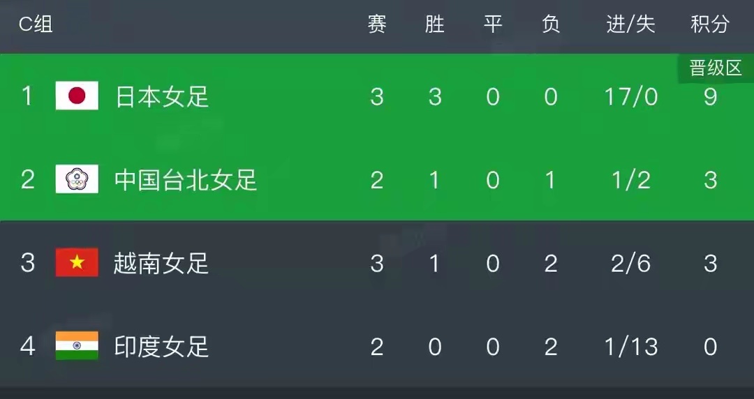2026女足亚洲杯小组赛收官,C组赛果爆出巨大差异:日本女足4-0横扫越南,以三战全胜狂轰17球的战绩锁定小组第一;中国台北3-1击败印度,以小组第二晋级。
