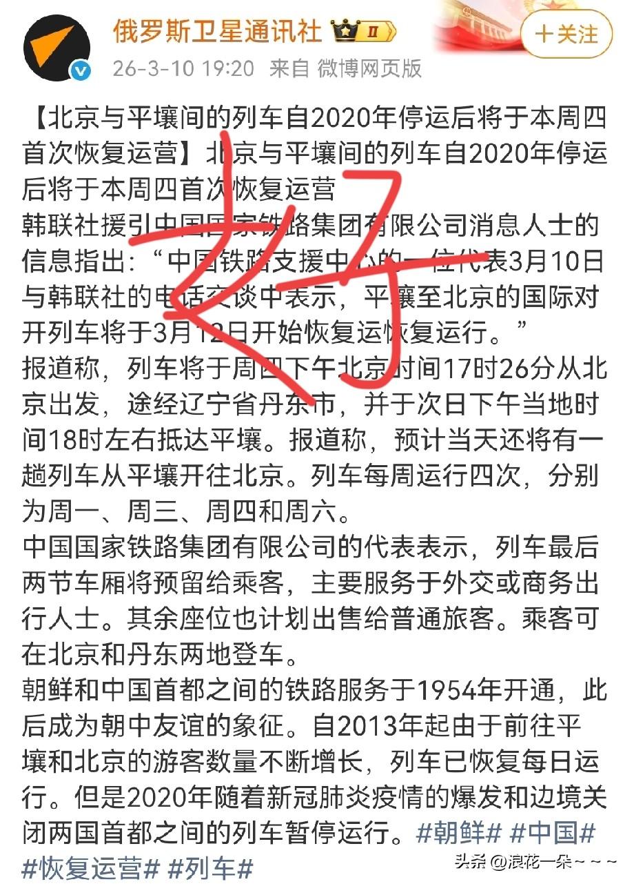 快讯!快讯! 据俄罗斯卫星通信报道:北京与平壤间的列车自2020年停运后将于本周四首次恢复运营? 我仔细看了一下这篇报道的具体内容,有座位是计划出售给普通旅客,乘客可以在北京和丹东两地动车。 这个快讯应该算是个非常不错的消息吧。也就是说,以后普通旅客如果去平壤的话可以坐火车了呗,也不知道还需不需要其他手续,比如说签证啊。 信息来源,俄罗斯卫星通讯社。
