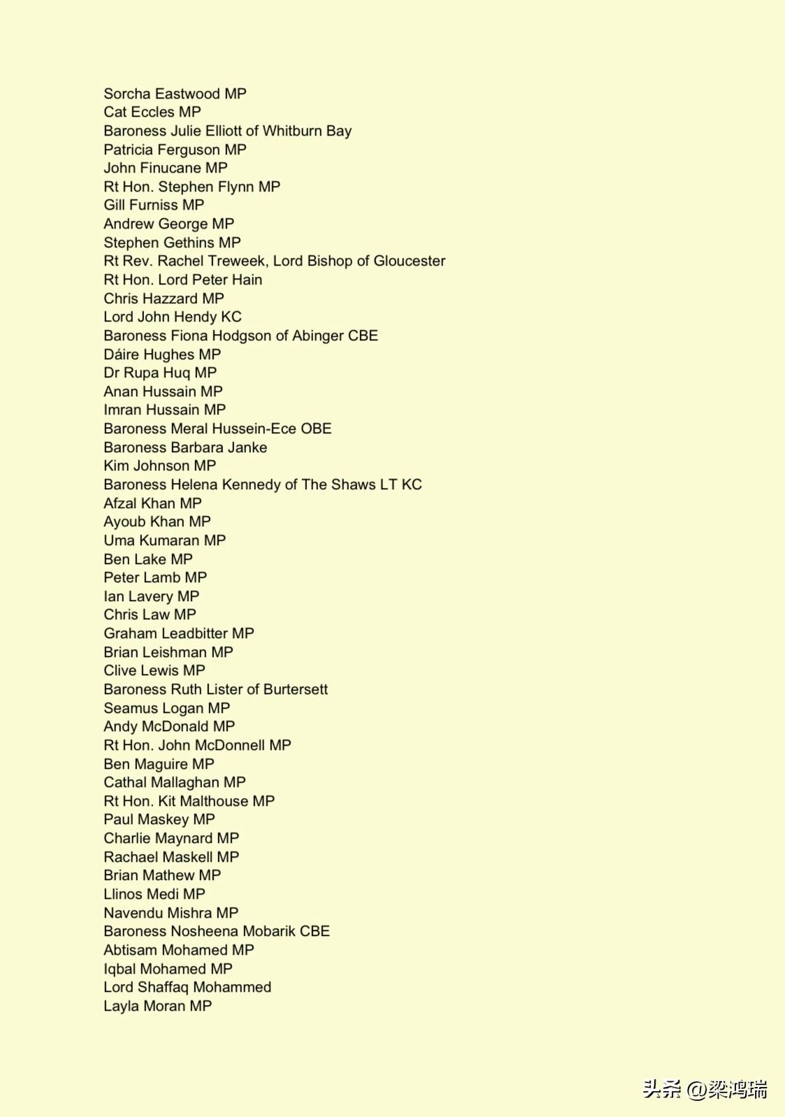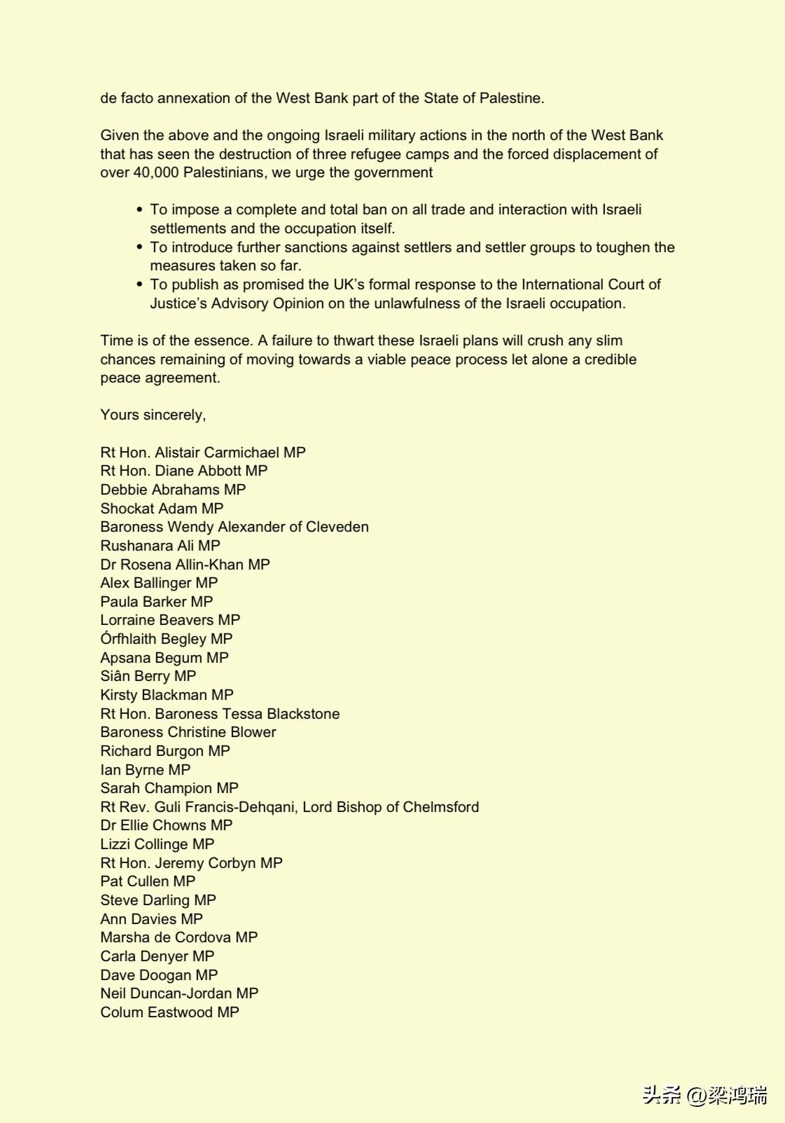 截至 2026 年 3 月 3 日,已有 119 名英国议员(跨党派议员及上议院议员)联名致信英国外交大臣伊薇特·库珀(Yvette Cooper),要求对以色列实施更严厉的制裁。 核心诉求: 全面贸易禁令:要求禁止与以色列非法定居点进行任何贸易和互动。 扩大制裁范围:对极端定居者及其组织实施进一步制裁。 回应国际法院 (ICJ):要求政府正式回应国际法院关于以色列占领行为非法性的咨询意见。