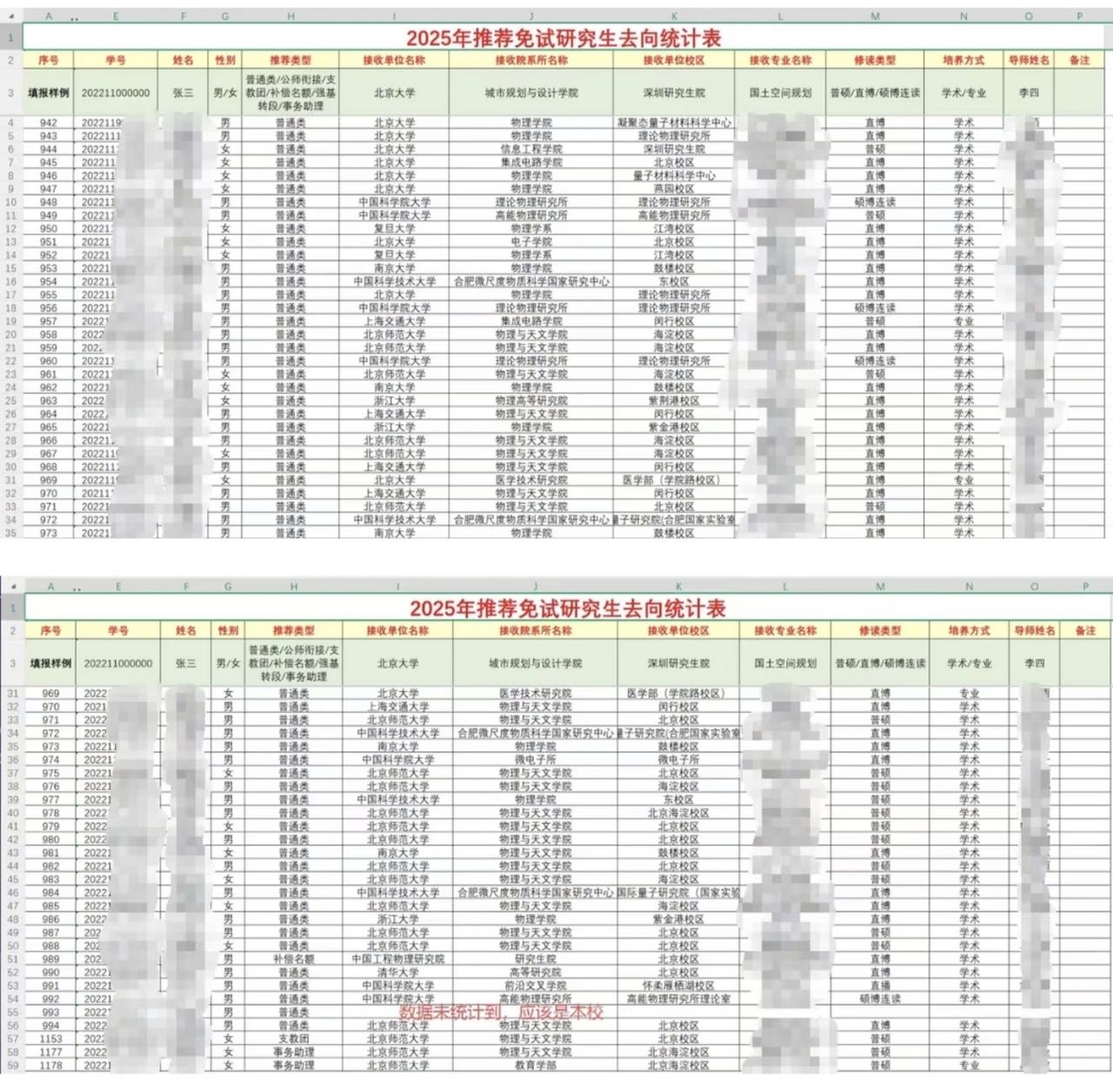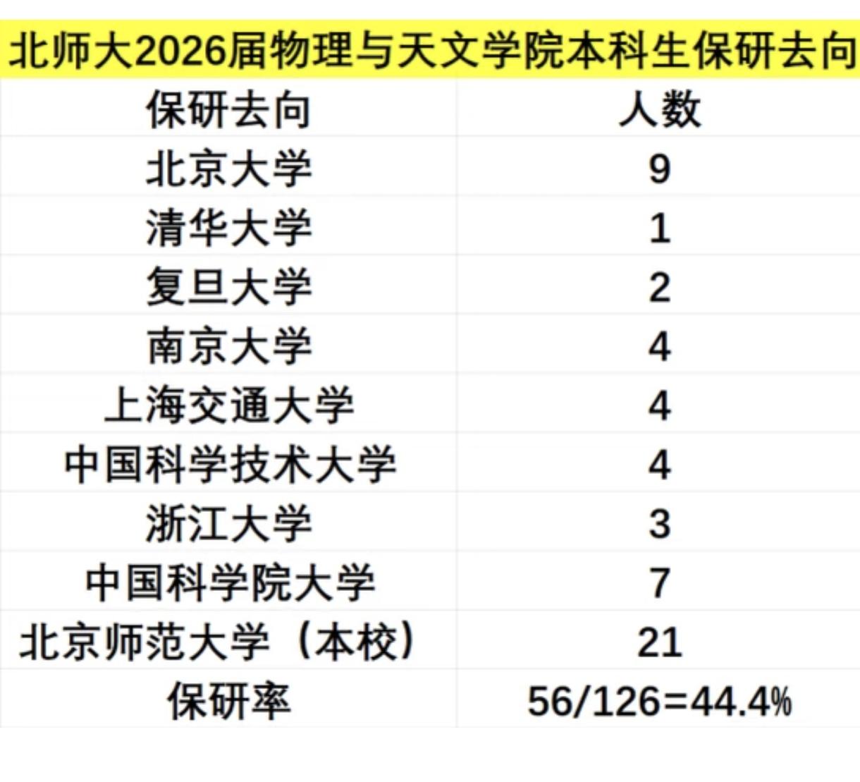 10个清北、6个复交,还有一堆985名校,北师大物理与天文学院保研去向的这个结果还是非常厉害的,不是么? 北师大2026届物理与天文学院本科生保研去向及人数如下: 北京大学9人、清华大学1人; 复旦大学2人、上海交通大学4人; 南京大学4人、中科大4人,浙大3人; 中国科学院大学(国科大)7人; 北京师范大学(本校)21人。 本届学院本科生总人数为126人,获得保研资格人数为56人,保研率约为44.4%。其中,保研至本校的人数最多,外校中以北京大学接收人数居首。清北一共10人,占到了快1/5。 从保研去向看,流向顶尖高校(如北大)的学生多为直博生,直博倾向明显,这与物理学科需要长期深耕的学术特性高度契合。 北京师范大学的理科实力,用一句话概括就是:“地理学全国顶尖,数理化生稳居前列,物理与天文是隐藏的‘深造王牌’。” 虽然北师大常被贴上“文科强校”的标签,但其理科实力在985高校中绝对属于上游水平,尤其是在基础学科领域,拥有极强的学术底蕴和升学竞争力。 只不过,近些年理工科为王,同城的北航北理名气已超过北师大,录取分数也是。曾经的“清北人师”现在更多的是“清北人航”。 如果你有意于研究深造搞科研,清北和国科大差一点的话,北师大是个好的选择。