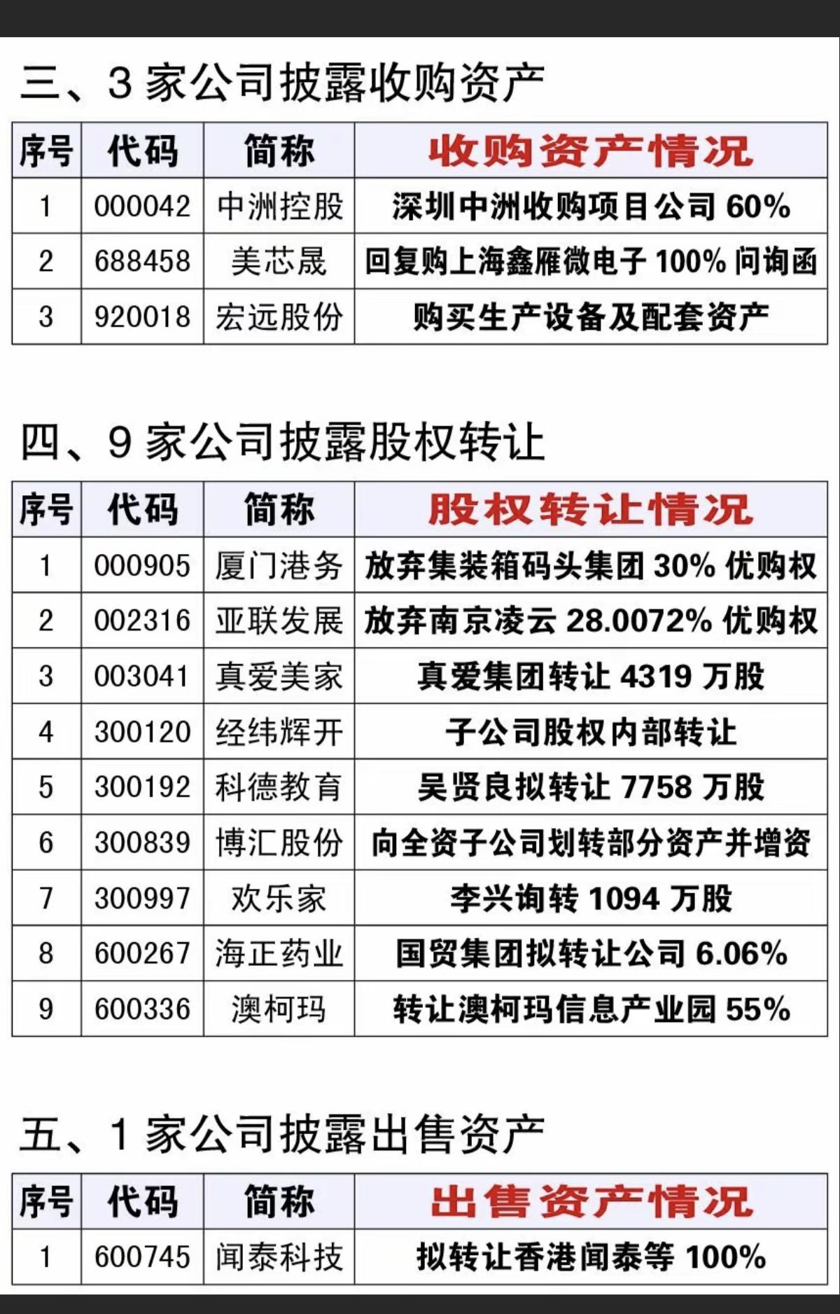 3.11周三 最新:资产重组、股权转让、实控人变更公告! 闻泰科技,拟转让香港闻泰股权。闻泰科技真是好事多谋啊,安世半导体股权争了半年还没有下文。 8家公司披露资产重组,科技类重组值得关注。另有2家实控人变更、3家收购资产9家股权转让,1家出售资产