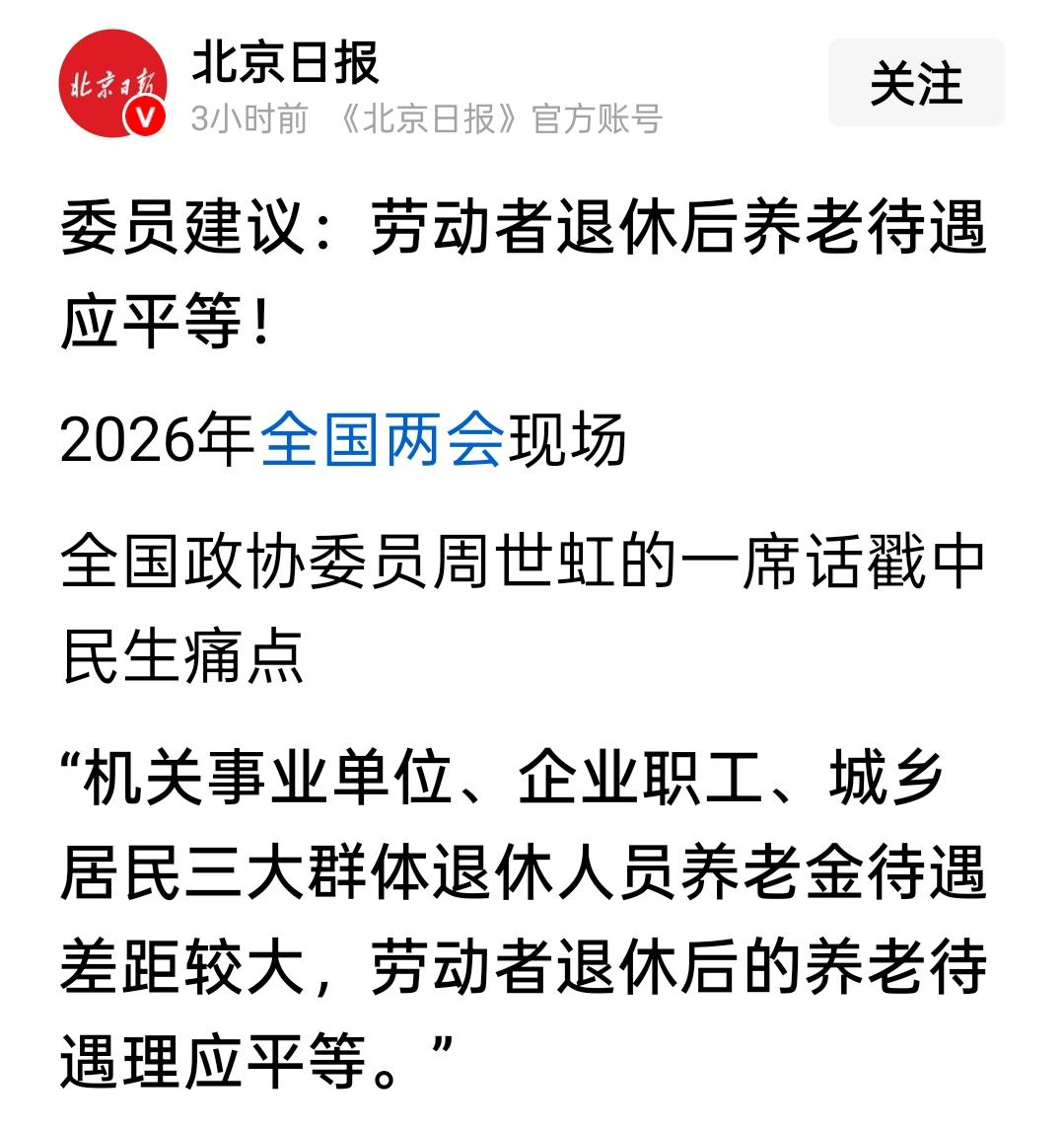 2026年全国两会现场,全国政协委员周世虹的一席话戳中民生痛点,“机关事业单位、企业职工、城乡居民三大群体退休人员养老金待遇差距较大,劳动者退休后的养老待遇理应平等。” 这个声音,让人听完心里不是滋味。 有人退休后月入过万,潇洒旅游;有人精打细算,生怕生病;还有人每月几百块钱,连基本生活都紧紧巴巴。 同样工作一辈子,退休后待遇差这么多,公平吗? 周委员说得直白:劳动者退休后的养老待遇,理应平等。 这话说到老百姓心坎里了。 养老金差距不是小事,它关乎每个人的尊严,关乎社会的公平底线。 那些养老金低的人,不是不努力,而是身份不同、岗位不同。但退休后,大家都回归普通百姓,凭什么待遇天差地别? 更扎心的是,很多养老金低的人,年轻时干的活最累,交的社保却最低。现在老了,身体累垮了,钱却不够花。 周委员的发言在网上引发共鸣,网友纷纷点赞:终于有人把这事摆上台面了。 有人说,缩小养老金差距,是检验社会公平的试金石。 也有人说,养老金改革不能只靠呼吁,需要实实在在的制度安排。 今年两会,这个话题能引起重视吗?我们拭目以待。 毕竟,每个人的今天,都可能是别人的明天。善待今天的老人,就是善待未来的自己。