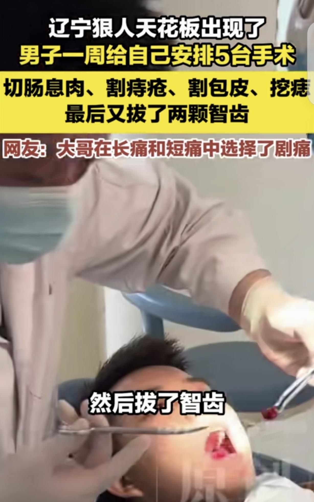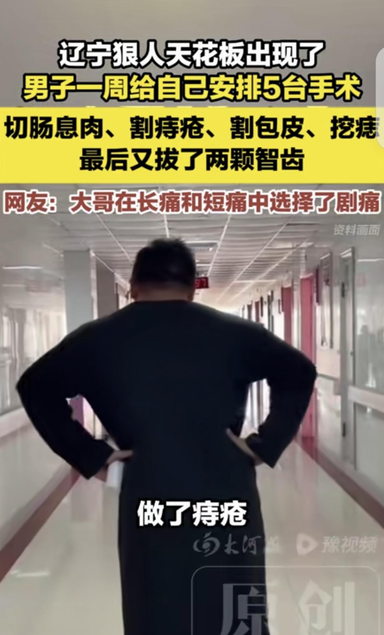 辽宁,一男子一周给自己安排5台手术,切肠息肉,割痔疮,割包皮,挖痣,又拔了2颗智齿,导致他不能吃,不能拉,不能喝,不能趴,简直太受罪了,在长痛和短痛中,他选择了剧痛。网友:还有不能哭,不能笑,不能走,不能跑! 胡先生最近成了大家茶余饭后的热门谈资,就因为他干了一件让人惊掉下巴的事儿,一周内给自己安排了5台手术,把自己折腾得够呛。 胡先生平时工作那叫一个忙,每天就像个上了发条的机器,在单位和家之间来回奔波,根本没时间好好照顾自己。 时间一长,身上就攒下了一堆小毛病。肠息肉、痔疮、包皮过长、身上的痣,还有两颗智齿。 这些小问题单个看都不算啥大病,可凑在一起,就像一群烦人的苍蝇,时不时地出来捣乱,让胡先生烦不胜烦。 眼瞅着过年有几天假期,胡先生一拍脑门,心想:干脆趁着这时间,把这些毛病一次性都解决了,省得以后老惦记着。 说干就干,他风风火火地跑了好几家医院,联系医生,安排手术时间。 手术安排得满满当当,一周内,切肠息肉、割痔疮、割包皮、挖痣,最后还拔了两颗智齿。 这五台手术一台接着一台,胡先生就像个勇敢的战士,在手术台上“冲锋陷阵”。 可等手术都做完了,他才真切地体会到什么叫“自讨苦吃”。 切完肠息肉,肚子里隐隐作痛,就像有只小手在里面不停地揪着。 割了痔疮,每次上厕所都像是在受刑,钻心的疼让他直冒冷汗。 割包皮后,伤口又痒又疼,走路都得小心翼翼,生怕碰到。 挖痣的地方,虽然不大,但也火辣辣地疼。 最要命的是拔智齿,嘴巴肿得像个馒头,连张嘴都困难,更别说吃饭喝水了。 这一连串的手术下来,胡先生简直陷入了“绝境”。 不能吃,看着面前的美食只能干瞪眼;不能拉,每次上厕所都成了最痛苦的事儿。 不能喝,嗓子干得冒烟也只能忍着;不能趴,伤口疼得根本没法找个舒服的姿势休息。 他躺在床上,心里后悔得直肠子都青了,早知道这么遭罪,就不这么着急一次性全做了。 网友们得知胡先生的事儿后,纷纷调侃:这是多恨自己呀?感觉这哥们是不是失恋了?这么折磨自己。 胡先生听了,也只能苦笑着摇摇头。他也明白了,以后做事可不能这么冲动,身体是革命的本钱,还是得一步一步来,可不能再这么“狠”对自己啦。 有人调侃,一颗布洛芬,管全身体,一支消炎药,杀灭所有伤口细菌,一瓶白蛋白可以让所有伤口快速愈合,一个床位管几个手术,真是性价比都超高。 这是对的!拔牙,不能吃,所以肠子就干净,肠子干净正好做息肉。索性不能吃,就直接割痔疮,剩的拉的时候遭罪。割了痔疮不能动,索性就割包皮,还省的磨皮肤疼了。索性不能动,痣就割了。这哥们太聪明了! 对此,你怎么看?