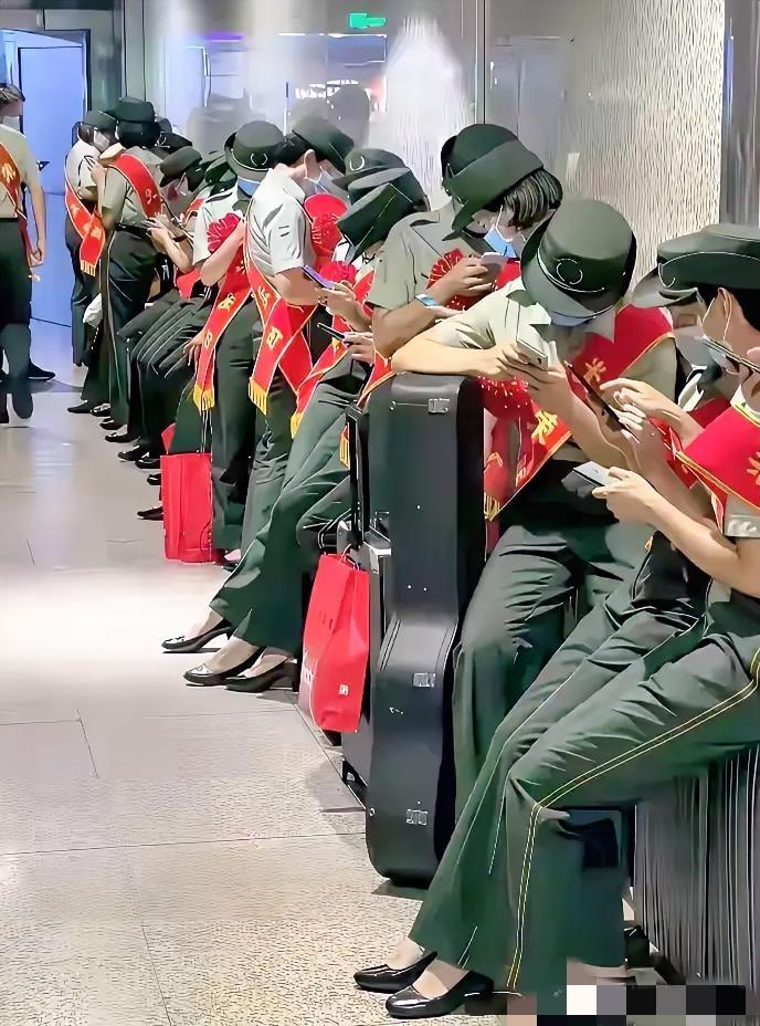 真真是难得一见的画面!一群女兵齐刷刷低头刷手机,个个化身“低头族”,手里的手机玩得不亦乐乎,完全没了平日里的严肃模样,这应该是集体退役了,才终于能自由自在。 要知道,军营里有着严格的规章制度,手机使用本就有明确要求,平日里女兵们身着戎装,始终保持着军人的严谨与干练,一言一行都透着飒爽,别说扎堆玩手机,就连私下里使用手机都有诸多约束,这样放松的画面自然难得一见。 画面里的女兵们围坐在一起,个个专注盯着手机屏幕,有的嘴角带笑,有的神情认真,完全沉浸在自己的小世界里,这份轻松自在和军营里的状态形成鲜明反差,也让人体会到她们褪去戎装后的可爱一面。