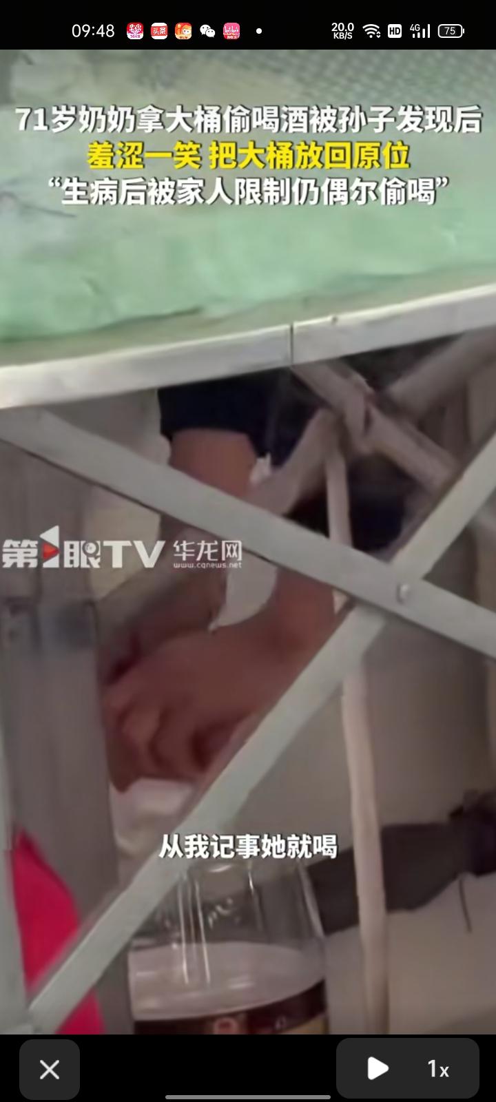 3月2日,绥化肇东市。网友晒视频称,奶奶拿着大桶喝酒,被发现后羞涩一笑,把大桶放回原位。奶奶今年71岁了,酒量还好,年轻时一顿四两缸子,最少两缸酒,得了脑出血后被家人限制仍偶尔偷喝