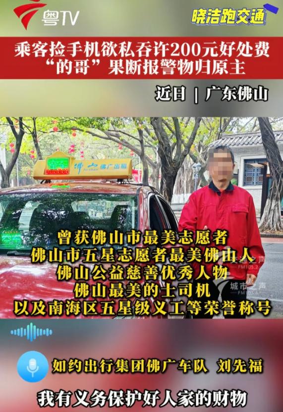 广东佛山,司机刘某接了个女乘客,可她刚一上车电话就不停的响,女乘客一直挂断,刘某越看越不对劲,问了她一个问题,结果竟然炸出了女乘客的秘密!刘某发现女乘客不对劲后,就一直从后视镜里观察她,结果发现对方多次尝试解锁手机,但都失败了,刘师傅一语道破玄机:这好像不是你的手机吧?没想到这一诈就诈出来了,女乘客说,她和失主住在同一个小区,待会就还给他,刘某警觉地要求自己保管手机,待会送给失主,可女乘客却一再推脱,最终竟要以200元来封刘某的口! 佛山一位出租车司机接了个女乘客,本来就是一趟普通的营运活儿,没成想这一路下来,还识破了一个小秘密,也算是帮人挽回了损失。 这位司机师傅刘先生,是当地一家出行集团佛广车队的,开出租车也有些年头了,平时营运就特别细心,遇到乘客有困难都会搭把手,事发那天傍晚,刘师傅跟往常一样接单营运,先接了一位疑似醉酒的乘客。 本来约定好的目的地还没到,对方突然说不舒服要下车呕吐,之后就坚持说自己到地方了,没付车费就匆匆走了,刘师傅虽有疑惑,但也没再多问,收拾好车厢就继续接单。 很快,一位女乘客上了车,可她刚坐好,车厢里就响起了手机铃声,女乘客手忙脚乱地拿起手机,看都没看就直接挂断了,一开始刘师傅没在意,觉得可能是无关紧要的电话,可没过几分钟,手机又响了,女乘客还是照样挂断。 反复几次,刘师傅心里就犯了嘀咕,越看越觉得不对劲,之后,刘师傅就趁着开车的间隙,从后视镜里悄悄观察这位女乘客,发现她拿着手机反复摆弄,手指在屏幕上划来划去,看样子是想解锁手机,可试了好几次,都没能解开。 刘师傅心里大概有了数,琢磨着这手机说不定不是她的,于是就随口问了一句:“这好像不是你的手机吧?”没想到就是这一句话,直接炸把女乘客问得一愣,了好一会儿才支支吾吾地说,她和失主住在同一个小区,等会儿就把手机还回去。 刘师傅常年开车,见多了各种情况,一看她这反应就知道没说实话,心里的警觉更甚,当即提出手机由他来保管,等会儿他亲自送给失主,这样也更稳妥。 可女乘客一听这话,就开始一再推脱,一会儿说不用麻烦刘师傅,一会儿又说自己马上就联系失主,说着说着,见刘师傅态度坚决,她竟然提出给刘师傅200元现金,让刘师傅别多管闲事,就当没看见这件事。 刘师傅当场就拒绝了,他说不是自己的东西,一分都不能要,乘客遗落在车上的物品,本来就该原封不动地还给失主,这是做人的本分,见女乘客还在纠缠,刘师傅也没再多说,直接选择了报警。 最后,在民警的协助和核实下,这部手机顺利送还到了上一位乘客,也就是真正的失主手里。 其实咱琢磨琢磨,这女乘客大概就是一时糊涂,见车上有部没人认领的手机,就动了贪念,想着能蒙混过关占为己有,没料到遇上了刘师傅这么细心又讲诚信的人。 而拾金不昧从来都不是什么难事,难的是在利益面前,能守住自己的本心,刘师傅的做法,不仅帮失主找回了手机,也给很多人提了个醒,不管是捡到什么东西,都该主动归还,贪小便宜最终只会自讨没趣。