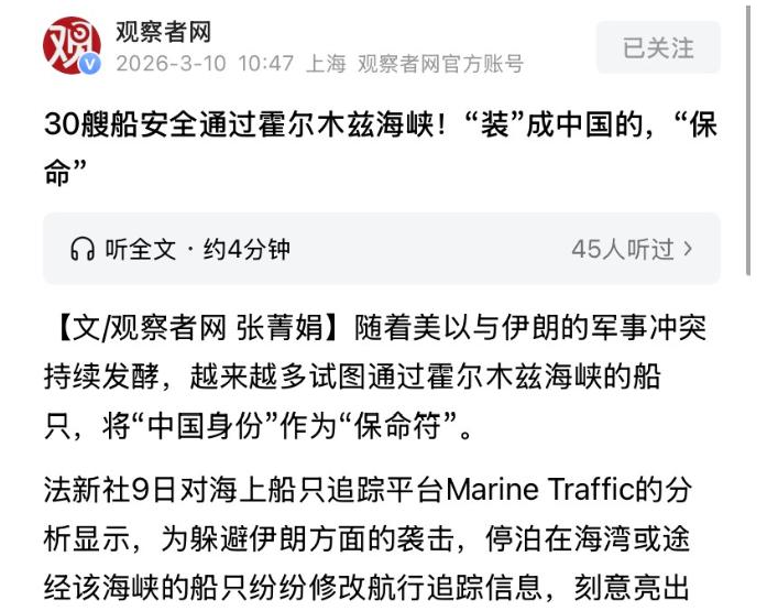 伊朗被骗了!又有30艘船伪装“中国籍”通过,其中还有一艘巴拿马货船 3月10日根据法新社报导,他们通过对海上船只追踪平台Marine Traffic发现,在过去的一周之内有30艘货船将自己的身份改为“中国船东”,或者“全员中国人”用这种刻意亮出和中国有关的方式通过了霍尔木兹海峡。 首先得说清楚霍尔木兹海峡到底有多关键,这条全长150公里、最窄处仅39公里的水道,是波斯湾通往印度洋的唯一海上出口,波斯湾沿岸沙特、伊拉克、阿联酋等七大产油国,除少数有陆上管道外,其余国家的油气出口几乎100%都要靠这里外运,全球每天约2000万桶原油、20%的液化天然气经此通行,说它是全球能源供应链的“主动脉”一点都不夸张。 对伊朗来说,这里更是自己的“经济命门”,伊朗约90%的石油出口依赖这条海峡,石油收入占其政府预算的比例约65%,海峡通不通畅直接关系到伊朗的财政和外汇收入。 但同时,伊朗又掌控着海峡北岸的岛屿和驻军,在当前的地缘局势下,这里成了各方博弈的核心区域,过往商船不仅要面对复杂的国际对峙,还得提防各种潜在的袭击、拦截风险,不少船只只能被迫锚泊在海峡入口外海,进退两难。 就在这样的背景下,法新社3月10日根据Marine Traffic的追踪数据披露,过去一周内有30艘货船通过修改海上追踪信息,刻意亮出和中国相关的身份,其中还有一艘巴拿马籍货船也在其中。 具体来看,这些船只的操作并不复杂,主要是在船舶自动识别系统(AIS)上做手脚——AIS就像商船的“电子身份证”,300吨以上的国际商船都强制安装,会持续向外发送船东、船员、船籍、航线等关键信息,原本是为了保障航行安全、避免碰撞,结果现在成了这些船只“伪装身份”的工具。 这些船要么把船东信息直接改成“中国船东”,要么标注“全员中国人”,通过这种方式把自己和中国绑定,而中国作为伊朗最重要的经济伙伴之一,在伊朗的地缘博弈中有着特殊地位,这些船只就是想借着这个身份,降低被伊朗方面拦截或袭击的风险。 这里就得分析一下伊朗为啥会“被骗”,或者说没及时识破这些伪装。伊朗对中国的经济依赖度很高,中国是伊朗重要的能源贸易伙伴,伊朗的原油很大一部分都是出口到中国,伊朗在处理海峡通航问题时,必然会把中国的因素考虑进去,对挂着“中国标签”的船只自然会多几分谨慎,不会轻易采取强硬措施。 其次,AIS信息的识别本身就有难度,这些船只只是修改了电子标识,并没有实际变更船籍或船员身份,从表面的电子信号看,确实和真正的中国船只难以区分,伊朗的海上监控系统主要依赖AIS数据,短时间内很难逐一核实每艘船的真实信息。 再往深了说,这些伪装的船只背后到底是谁,其实值得琢磨。从目前的信息看,这些船大多是外籍船只,有巴拿马籍、马绍尔群岛籍等,很多都是所谓的“方便旗”船舶,也就是在这些国家注册船籍,但实际船东和船员可能来自其他国家,这种注册方式本来就是为了便于税务筹划和规避监管,本身就存在船籍信息和真实资本归属脱节的问题。 所以这些船伪装成中国身份,大概率不是中国船东的主动行为,而是其他国家的船东为了规避风险,临时修改AIS信息,把自己“挂靠”到中国名下。毕竟在当前的局势下,通过霍尔木兹海峡的风险太高,一旦被拦截或袭击,不仅会造成巨额经济损失,还可能引发外交纠纷,这些船东只能出此下策,找个“护身符”来保平安。 还有一点不能忽略,这些船只的伪装不是短期行为,而是已经形成了趋势,后续可能会有更多船只效仿,这会让霍尔木兹海峡的通航环境变得更加复杂。 伊朗接下来大概率会加强AIS信息的核实力度,甚至可能启用其他监控手段来识别船只真实身份,这会进一步增加商船的通航成本和时间成本,不少滞留的商船可能会被迫选择绕行,而绕行不仅会增加运输距离和油耗,还会延误交货期,进一步加剧全球供应链的紧张局面。 同时,这种行为也会引发各方的博弈,美国等其他国家可能会借机指责伊朗管控不力,进一步加剧地区紧张局势,而伊朗也可能会采取更激进的措施来维护自身利益,形成恶性循环。 总结下来,30艘船伪装中国籍通过霍尔木兹海峡,本质是在当前复杂的地缘局势下,商船为了规避风险而采取的极端避险手段,伊朗之所以会“被骗”,既有自身管控逻辑和技术识别的局限,也有地缘博弈和经济利益的多重因素影响。 这件事不仅暴露了国际航运秩序的漏洞,也凸显了霍尔木兹海峡作为能源命脉的脆弱性,同时给伊朗、中国以及全球航运、能源领域都带来了一系列潜在的影响和挑战,后续的发展还需要各方的共同关注和应对。