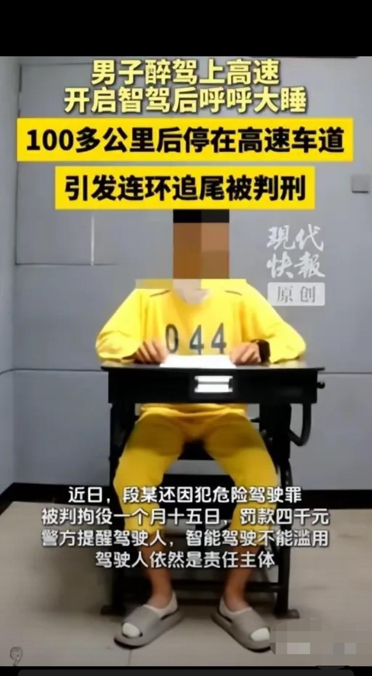 心真大!”扬州,男子与朋友聚会,喝了不少酒,突然心血来潮,要开车上高速回老家,上车他就困了,直接开启“智驾”便放心呼呼大睡,谁料,男子双手离开了方向盘,辅助驾驶停止工作,车停在了高速第二车道,导致连环追尾,最终,男子悲剧了。 近日,江苏扬州京沪高速上,发生了一件让人血压飙升的事! 男子段某前一晚和朋友聚餐,酒喝了一杯又一杯,直接喝到酩酊大醉。 谁知道他脑子一热,非要连夜从常州开车回河南老家。 醉驾上高速也就算了,开了没一会儿,酒精上头+疲惫不堪,他直接困得睁不开眼。 正常人早就找服务区休息了,他倒好! 直接开启智能辅助驾驶,双手一松,往座椅上一躺,呼呼大睡起来! 他是不是真以为,智驾=全自动驾驶? 结果可想而知! 双手脱离方向盘后,系统立刻判定异常,直接停止工作。 一辆车,硬生生停在了高速第二车道! 后面正常行驶的车辆根本反应不过来! 第一辆车直接撞上,紧接着又来一辆追尾,三车连环撞,多人受伤! 而这位大哥,全程在车里睡大觉,撞车都没醒! 等民警到场把他叫醒,他一脸懵: “我不知道啊,我啥也不记得了……” 一查酒精含量:99.3mg/100ml,妥妥的醉驾! 最终结果: 吊销驾驶证,5年内不得重考! 危险驾驶罪,拘役1个月15天,罚款4000元! 网友评论炸了: ✅“我开智驾都双手不敢离开方向盘,他直接睡大觉,心是真的大!” ✅“无辜路人太惨了,正常开车被追尾,全是他作的!” ✅“醉驾+高速昏睡,这已经不是心大,是完全没底线!” 我的看法: 真的特别想吐槽! 智能辅助驾驶,是辅助,不是替你开车! 更不是醉驾后的“保命符”! 多少事故,都是因为驾驶员心存侥幸,盲目相信科技,无视规则。 你图一时方便,却可能毁掉几个家庭。 最后提醒所有司机: 喝酒不开车,开车不犯困! 智驾再高级,人命只有一次! 遵守交规,敬畏生命,比什么都重要!
