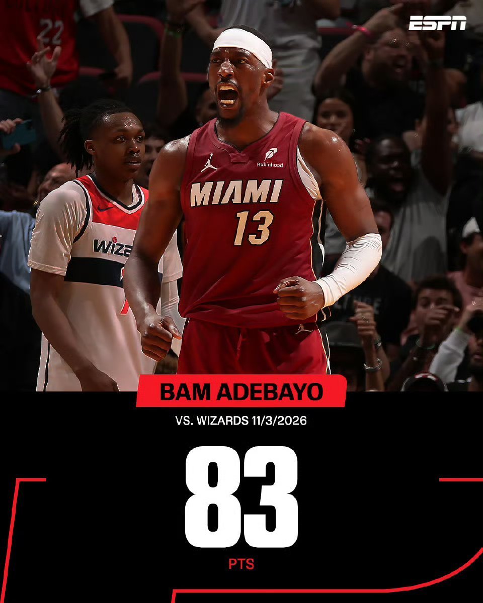 真没想到,居然还有人能超越科比当年创造的单场81分纪录!NBA常规赛热火150比129战胜奇才的比赛中,阿德巴约贡献83分,一举超越科比,成为仅次于张伯伦100分之后的历史第二人!阿德巴约83分