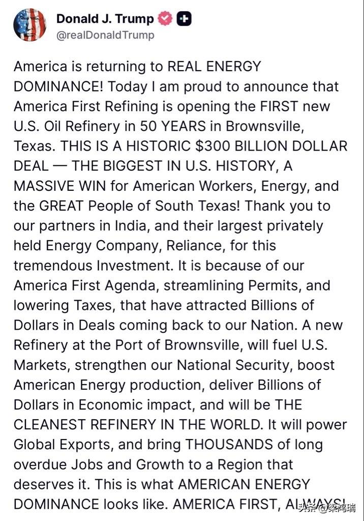 最新消息:美国已经五十年没有新建炼油厂了。整整五十年。上一座炼油厂破土动工时,尼克松还是总统,当时油价是每桶3美元。 特朗普刚刚宣布了一项价值3000亿美元的协议,将在德克萨斯州布朗斯维尔港建设一座炼油厂。这将是美国历史上最大的能源投资。该项目将于2026年第二季度破土动工,并签署一份为期20年的具有约束力的承购协议。炼油厂将加工美国页岩原油,为德克萨斯州南部创造数千个就业岗位,并有望成为“世界上最清洁的炼油厂”。 领投方是印度人。 由安巴尼家族控股、持股比例达50.39%的信实工业公司(Reliance Industries)是已确认的主要外国合作伙伴。该公司运营着位于古吉拉特邦贾姆讷格尔的炼油厂,该炼油厂是全球最大的单体炼油厂。特朗普在Truth Social网站上感谢信实工业公司,称其为“我们在印度的合作伙伴,也是印度最大的私营能源公司”,并感谢其“巨额投资”。 现在同时记住两个事实。 印度信实工业公司正斥资数十亿美元在美国一家炼油厂投资,加工美国页岩油,以巩固美国的能源主导地位。与此同时,莫迪领导的印度政府以战时折扣价从俄罗斯进口超过40%的原油,并于3月7日拒绝了美国提出的为期30天的俄罗斯石油进口豁免的“许可”方案(“印度从未依赖任何国家的许可”),并继续通过恰巴哈尔港物流购买伊朗原油。 同一个国家,同一周。一手建设美国能源独立,一手购买俄罗斯原油。这不是虚伪,这是莫迪主义的最高体现。 多方结盟意味着印度不选边站队,而是选择交易。加入四方安全对话机制(QUAD)是为了安全;从俄罗斯获取原油是为了能源;从伊朗获取恰巴哈尔港的使用权;从信实资本获取美国炼油资源;从以色列国防技术获取军事现代化;从海湾地区的汇款中维持一千万印度劳工的生计。印度不与任何强权结成正式联盟,而是最大限度地利用与所有强权的联系。每段关系都是交易性的,每一项承诺都经过权衡,每一个矛盾都服务于某个利益集团。 特朗普需要炼油厂,因为伊朗战争已经证明,50年来美国没有建设炼油厂,导致美国不得不依赖外国炼油能力来生产本国页岩油产品。霍尔木兹海峡的关闭不仅切断了石油运输,还切断了为美国汽油、柴油、航空煤油和石化产品提供原料的成品油供应链。建设国内炼油能力是对“精算战争”的结构性应对:如果仅靠保险表格就能封锁咽喉要道,那么唯一的防御手段就是避免被封锁。 安巴尼需要这笔交易,因为信实集团的贾姆讷格尔炼油厂加工的墨西哥湾原油要经过霍尔木兹海峡。而霍尔木兹海峡布满了地雷,没有保险,并且由31个独立的伊朗伊斯兰革命卫队指挥部负责守卫。进军美国页岩炼油领域,正是为了对冲目前令信实集团主要原料运输路线瘫痪的危机。这并非慈善之举,而是全球最大的炼油商在购买任何保赔协会都无法提供的保险。 战争引发了危机,危机促成了协议。签署协议的国家,其总理刚刚被“允许”购买俄罗斯石油,却告诉美国它从未提出过购买请求。 五十年。一场战争。一通电话。而建造这座大厦的亿万富翁,却来自华盛顿难以抉择是制裁还是赞扬的国家。