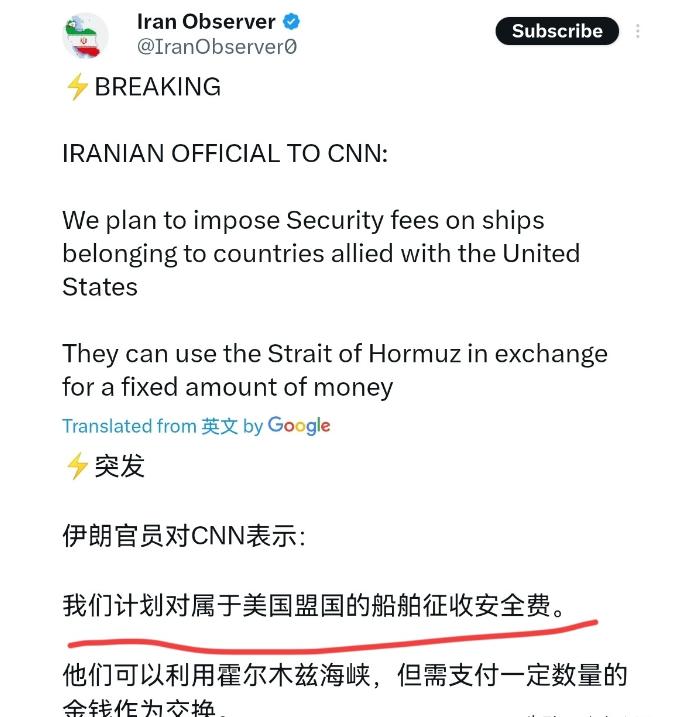 伊朗又生一计,伊朗改收“过路费”了!伊朗不再要求美国的盟友及海湾国家,以驱逐美国和以色列的大使为条件,换取通过霍尔木兹海峡的资格了。3月10日,伊朗官员最新表态称,我们计划对与美国结盟的国家的船只征收保安费,他们可以使用霍尔木兹海峡,但需要交固定数额的费用。 说白了,伊朗从“逼盟友驱逐美以大使换通行”改成“对美盟友船只收保安费”,表面是从强硬政治施压转向务实收费,实则是伊朗在霍尔木兹海峡博弈中,从“零和对抗”转向“分层管控、精准分化、以战养战”的战略升级,既守住地缘优势,又避免全面树敌。 要知道,就在美以与伊朗冲突升级、霍尔木兹海峡航运近乎停滞、全球油价剧烈波动的节骨眼上,伊朗突然调整规则:此前要求美盟友、海湾国家驱逐美以大使才能安全过海峡,3月10日直接改口——不用赶大使,交固定“保安费”就能通行。这操作看似“退一步”,实则把“要么站队、要么交钱”的选择题抛给美国阵营,比之前的强硬条件更难拒绝,活像把“死命令”变成了“收费单”,让对手进退两难。 可这绝非临时妥协,而是伊朗权衡利弊后的精准算计。此前“驱逐大使”的条件过于极端,沙特、阿联酋、欧洲等国根本不敢接,反而容易把海湾产油国彻底推向美国,还会给美以联合巡航、军事介入提供借口。改成收费后,既保留了对美盟友的惩戒,又给了对方“花钱买平安”的台阶,避免全面封锁引发国际围攻,本质是“以最小代价换取最大话语权”。 说实话,伊朗这招精准拿捏了美国盟友的软肋。霍尔木兹海峡承担全球约20%的石油运输,沙特、阿联酋、日韩、欧洲的能源命脉全绑在这里。战争险保费已暴涨超10倍、航运成本飙升,相比航道彻底中断、供应链崩溃的风险,一笔固定“保安费”反而成了“划算的选择”。伊朗等于把军事威慑转化为“规则收费权”,让美国盟友不得不为“站队美国”买单。 并且,收费模式还能实现“以战养战”,同时分化美国阵营。对伊朗而言,这笔费用既能补充战争开支,又能通过“收费与否、收费多少”区别对待不同国家——对态度缓和的盟友少收或缓收,对紧跟美国的国家多收,逐步瓦解美以同盟的凝聚力。更关键的是,伊朗还保留了“驱逐大使可免费通行”的选项,继续给海湾国家留“倒戈空间”,让美国阵营内部互相猜忌。 更关键的是,这步棋彻底打破了美国的“航道自由”叙事。特朗普一直宣称霍尔木兹海峡“完全开放”,伊朗收费等于用实际行动宣告“海峡主导权在我”,直接打脸美国的霸权说辞。美国若强行反对,要么派军舰护航(成本极高、易擦枪走火),要么眼睁睁看着盟友交钱、自己颜面扫地,陷入“管不住、护不起”的尴尬境地。 要清楚,霍尔木兹海峡从来不是单纯的航运通道,而是中东博弈的“战略命门”。历史上伊朗多次用海峡控制权反制西方,从封锁到设限再到收费,手段越来越成熟。此次调整,不过是伊朗从“对抗型威慑”转向“经营型管控”的必然选择——不追求彻底封锁,而是把优势变成长期、可控的博弈工具。 而未来,霍尔木兹海峡大概率会进入“收费通行、分层管控”的新常态。伊朗会逐步明确收费标准、执行细则,把“保安费”制度化;美国盟友会在“交钱保航运”和“得罪美国”之间反复权衡,部分国家可能悄悄降低对美配合度;美以则可能推动“替代航道”或联合巡航,但短期内难以撼动伊朗的主导地位。关键转折点在于:若油价持续飙升、全球经济承压,国际社会可能推动谈判;若美以继续升级打击,伊朗不排除再次收紧管控,甚至重启更严厉的限制措施。 说到底,伊朗改收“过路费”,本质是从“硬碰硬”到“巧博弈”的战略成熟。看似放弃了极端条件,实则把地缘优势转化为实实在在的规则与利益,既避免了全面孤立,又牢牢攥住了全球能源的“扳机”。这也再次证明:在大国博弈中,灵活务实的策略,远比一味强硬更能守住核心利益。 以上是小编个人看法,如果您也认同,麻烦点赞支持!有更好的见解也欢迎在评论区留言,方便大家一同探讨。