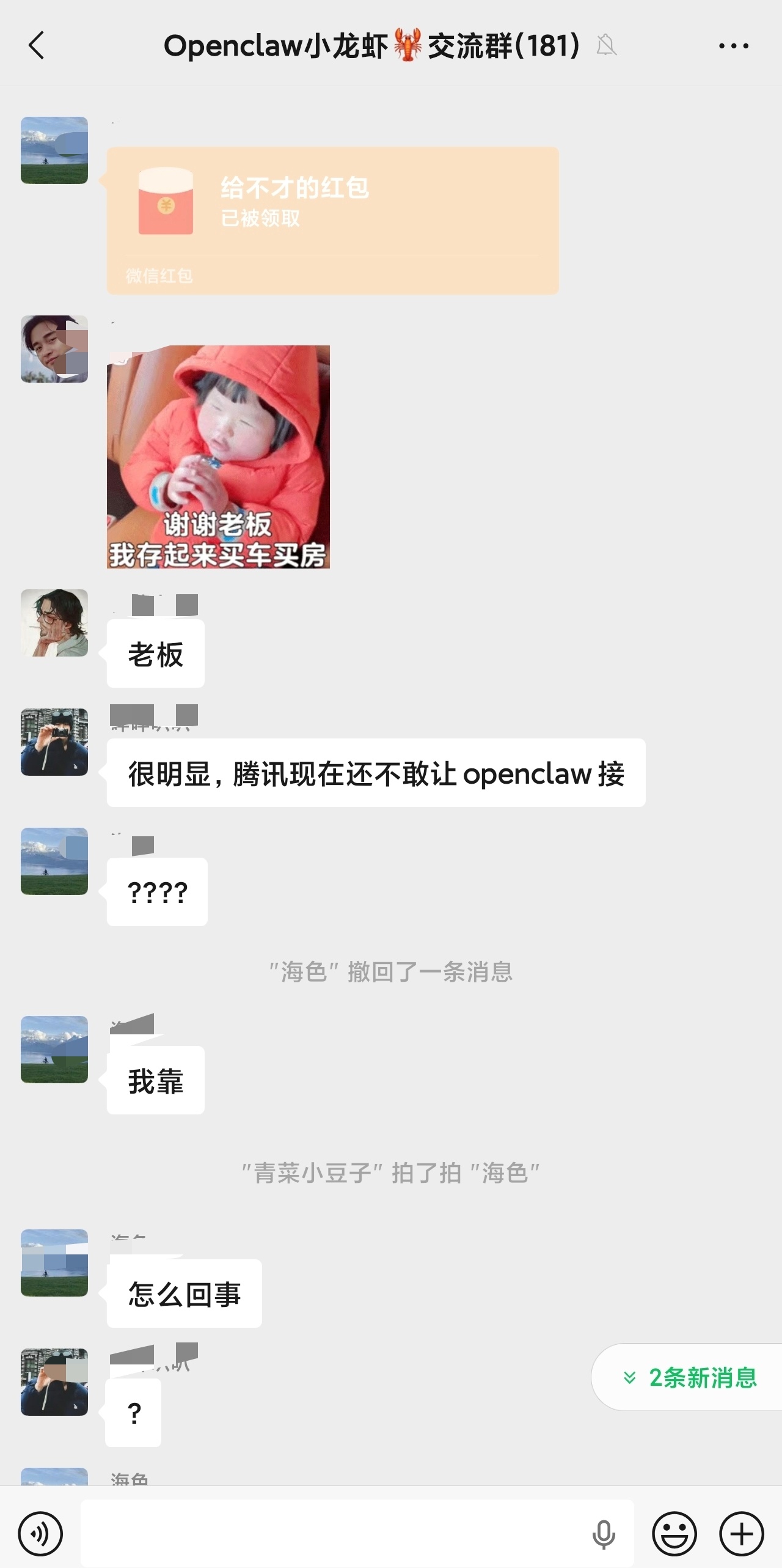 还真能发红包呀?微信群有人说龙虾自动发红包,打开一看发了0.14元,还说是自己微信最后的钱当然,腾讯已辟谣。