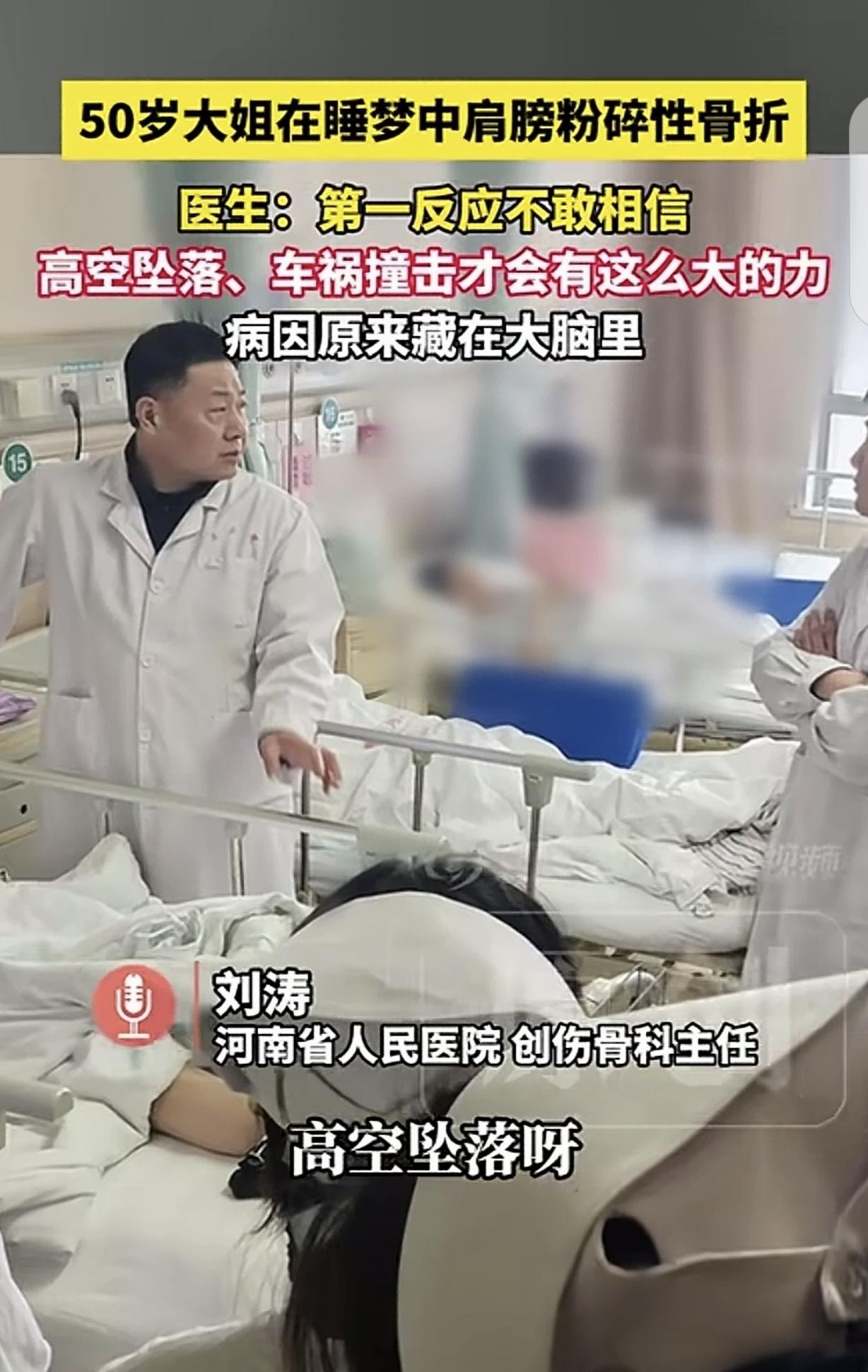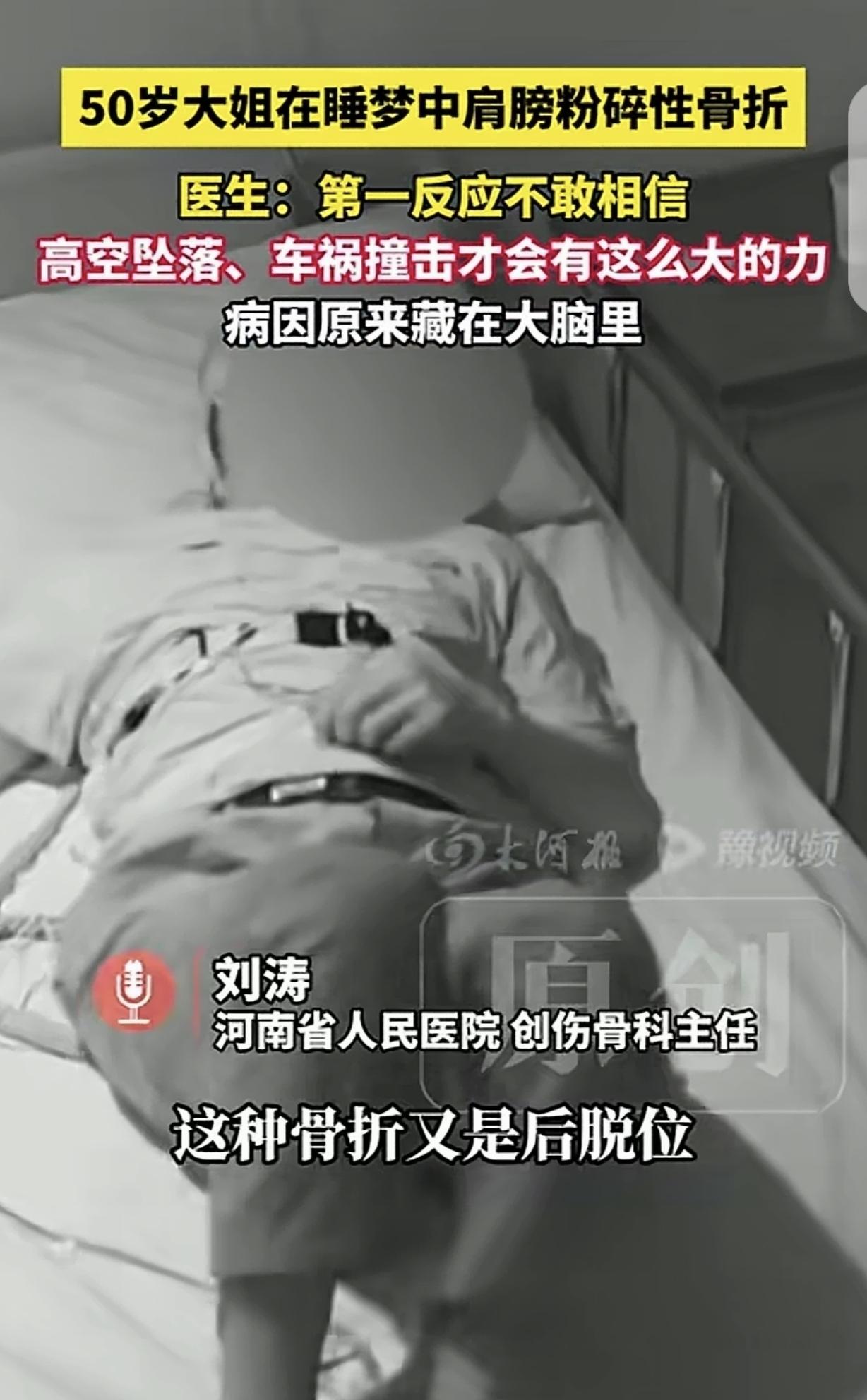 “离奇!”河南,一50岁女子,在睡梦中粉碎性骨折,肩膀骨头碎成7-8块,丈夫却说,女子全程都在床上躺着,医生直呼不敢相信,只有高空坠落,车祸撞击才会有这么大的力,事情顿时变得扑簌迷离。网友:家属绝对有问题。 3月10日凌晨三点多,床边的人被一声闷响和痛呼惊醒。 灯亮起来时,张某某蜷着身子,右肩明显肿起,碰一下就疼得厉害。 更吓人的是她眼睛半睁,目光发直,叫她也没有回应。 家属慌乱中做了掐人中之类的急救动作,过了几分钟,她才慢慢缓过来。 清醒后的第一句话不是解释发生了什么,而是右胳膊像断了一样抬不起来。 家人把人送到医院。 影像检查很快做完,结果把接诊医生都看愣了。 右肩位置出现粉碎性骨折,碎块多达七八片,关节也脱了位。 这种片子常见于严重车祸或高处坠落的患者身上。 当家属反复强调人整夜都在床上,医护人员难免多问几句细节。 病房里一度安静得不自在,家属也被问得涨红了脸,表示并不知道其他的事情。 为了把话说清楚,医生把思路放回到医学诊断上。 能把肩膀打成这样,外力是一个可能的原因,骨头本身变脆也是一个原因。 于是检查顺着骨质疏松、肿瘤一类的病理性骨折去排除。 结果并不支持骨头先天脆弱。 这时影像里一个不太起眼的细节被盯住了。 肩关节出现后脱位。 这种脱位在全部肩关节脱位里占比很低,不到4%。 临床上最常见的触发场景之一,是癫痫发作或电击样的强烈肌肉收缩。 线索一出来,医生开始追问既往情况。 张某某这才想起,近三年身体总有小插曲。 有时突然头晕头疼,有时像短暂走神,十几秒到一两分钟就过去。 她一直当作过度劳累,休息一下就算了。 神经内科会诊后安排了脑电图监测。 结果把谜底掀开。 她存在癫痫发作,而且偏向睡眠期发作。 这类发作不一定会出现大众印象里的口吐白沫和全身剧烈抽动。 有的人表现成发愣、僵直、短暂失应答,旁边的人只觉得怪。 那天夜里,她在发作时肌肉出现强烈痉挛。 上肢肌群像被瞬间拉满的弹簧,爆发力沿着胳膊传到肩关节。 关节先被拽到异常位置,骨头在扭转和牵拉里碎裂,才出现粉碎加脱位的组合伤。 这类病例在医院里不算常见,却有明确的医学记录。 不少人听完会疑惑,肌肉能有这么大劲儿吗。 答案是能。 癫痫发作时的肌肉收缩属于失控的强收缩,强度远高于日常用力。 再叠加中年阶段骨量变化、关节结构差异,就可能把罕见变成现实。 病因确认后,治疗重点分两条线。 一条线处理骨折脱位。 另一条线控制癫痫,避免再次发作带来二次伤害。 她的肩部碎块复杂,有的碎片还跑到关节后方。 手术团队需要把碎骨逐块复位固定,因为骨头太碎了,整个过程就像是在拼图。 医生尽量保住原生关节,减少直接置换带来的后续负担。 术后她开始进入康复阶段,肩关节活动度需要一点点恢复过来。 同时她也开始规律接受抗癫痫治疗和随访。 这件事在网上发酵后,评论区出现了两股声音。 一股是调侃家属差点说不清。 一股是提醒遇到离谱伤情别急着下判断,先把检查做完整。 也有人顺手分享身边的怪事。 有人转方向盘时胸口疼,查出肋骨骨折,却想不起任何撞击。 有人翻身压到手臂,骨折后好几个月都没恢复利索。 这些经历未必都指向同一种原因。 它们共同点是,人体并不总按常识给出反馈。 对普通家庭更实用的做法,是记住几个信号。 睡眠中出现短暂发直、叫不应、四肢僵直,醒后完全想不起来过程,需要尽快去做神经系统评估。 反复出现头晕、走神、短暂停顿感,也别不当一回事。 家里若有癫痫患者,劳累、熬夜、睡眠不足可能增加发作风险,夜间看护和安全环境更重要。 遇到不明原因的骨折,除了骨质问题和外伤史,也要把癫痫这类少见选项放进排查清单。 张某某这次的骨折把一个隐蔽问题推到了台面上。 对她来说,更现实的任务是按时吃药,把复查做全,把肩膀慢慢练回日常生活能用的程度。 对围观的人来说,这事留下的经验很朴素。 身体给的小提示经常很轻,拖久了就可能 要付出一次大代价。