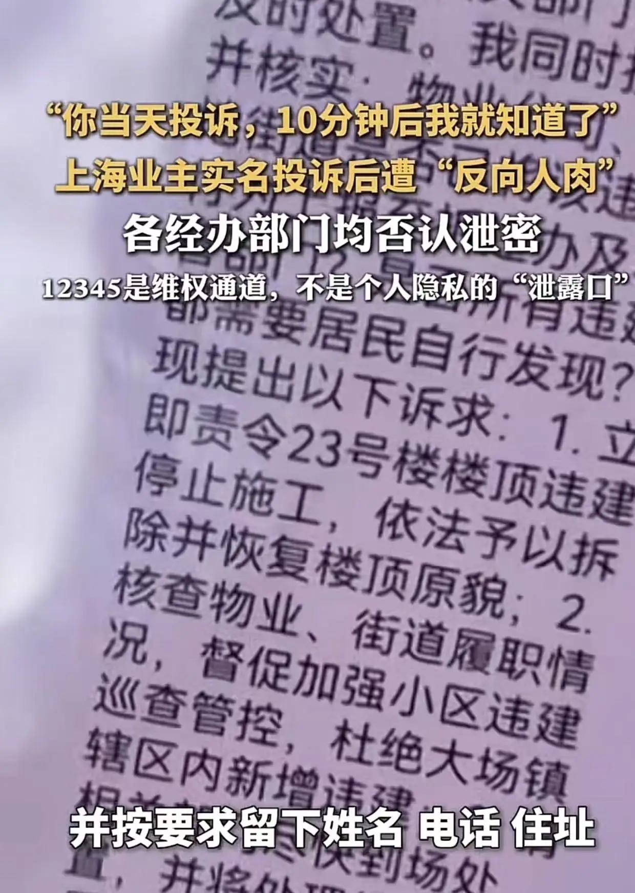 细思极恐!上海,男子实名举报小区邻居违建后,自己的隐私信息反被邻居 “扒得底朝天”,邻居猖狂称:“你投诉10分钟,我就知道你家住哪里了!”男子:“吓得两周不敢回家,担心被报复!更不明白信息是怎么被泄露的!” 你敢信吗?一次再正常不过的实名举报,竟让一个守法公民,活成了有家不敢回的“逃犯”。 上海宝山的邱先生,只是看不惯楼顶违建,通过12345如实反映情况,留下姓名、电话、住址,本以为是维护公共利益,没想到,噩梦就此开始。 官方还没上门核查,被举报的邻居电话先打了过来。对方不仅一字不差念出他的举报内容,精准报出家门牌号、手机号,更恐怖的是,连他母亲日常锻炼的地点、他本人的下班时间,全都摸得一清二楚。 嚣张的语气、精准的信息,赤裸裸的威胁,换谁都会后背发凉。 邱先生当场崩溃报警,可即便警方警告,他依旧不敢踏进家门,整整两周,在外漂泊,生怕一回家就遭遇不测。 最让人愤怒的是,涉事各方纷纷甩锅,都说自己没泄密。那信息到底怎么流出去的?10分钟就被精准锁定,背后到底是谁在出卖正义? 我们总说,实名举报受法律保护,个人信息严禁泄露。可现实是,有人把保密义务当耳旁风,把群众的信任当筹码,让维权者寒心,让监督者胆怯。 这不是简单的邻里矛盾,是对法律底线的践踏,是对普通人安全感的摧毁。 如果连正当举报都要付出“被扒光隐私、被威胁报复”的代价,以后谁还敢站出来说公道话?谁还敢维护小区的秩序? 必须彻查泄密源头,严惩责任人,给邱先生一个交代,给所有普通人一个安心的答案。 正义不该被出卖,举报人不该被伤害。评论区说说,你遇到过类似的事吗?你还敢实名举报吗?违建核查 违建大楼