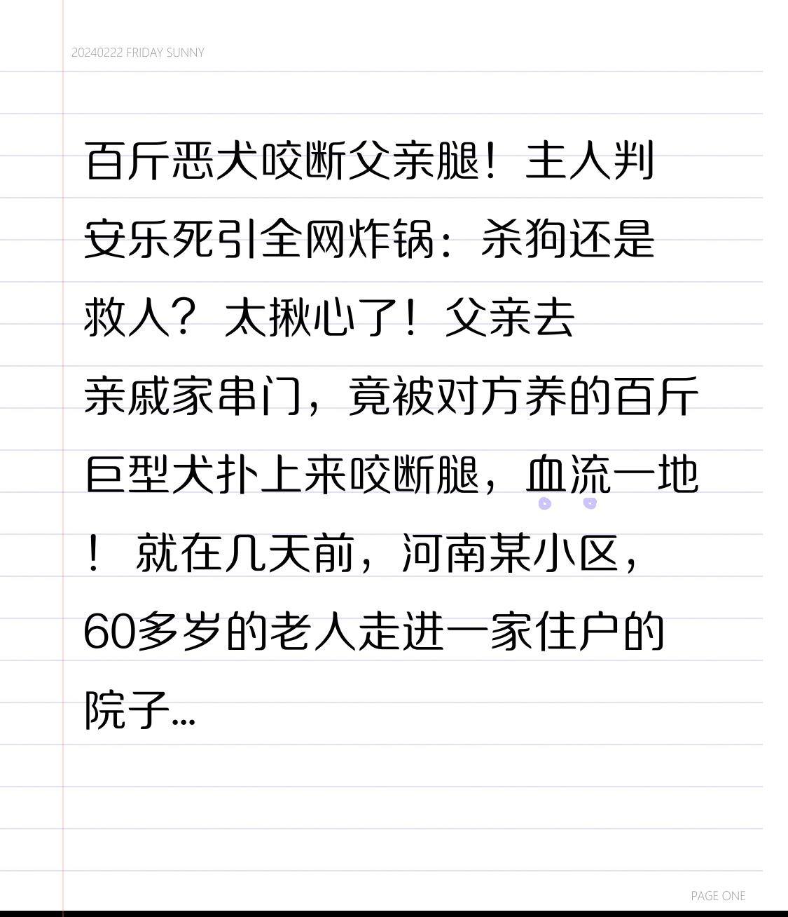百斤恶犬咬断父亲腿!主人判安乐死引全网炸锅:杀狗还是救人? 太揪心了!父亲去亲戚家串门,竟被对方养的百斤巨型犬扑上来咬断腿,血流一地! 就在几天前,河南某小区,60多岁的老人走进一家住户的院子,只想问问事情,结果冷不防窜出一条百斤重的大型猛犬。那狗疯了一样扑上去,死死咬住老人的左腿不放,邻居听到惨叫赶来才勉强把狗赶走。老人被送进ICU,医生说腿部神经严重受损,手术难度极大,这一下,不仅老人遭了大罪,整个家庭的天都塌了! 更让人愤怒的是,狗主人不仅没道歉,还理直气壮说“狗不咬人”,甚至想花点钱了事。最后在多方压力下,相关部门才下令对肇事犬只实施安乐死。本以为是大快人心,没想到,全网却吵翻了天! 一边是支持杀狗的网友:“恶犬不除,后患无穷!百斤的狗咬死人都够格,凭什么不处死?” 另一边却是大批爱狗人士破防:“杀狗太残忍了!狗是无辜的!是主人没管好,凭什么拿狗抵命?” 甚至还有人发起质疑:“老人有没有主动挑衅?万一老人是逗狗了呢?” 这场争议迅速升级,大家吵得不可开交。但大家有没有想过,这件事里最痛苦、最无辜的人,其实是躺在病床上的那位父亲? 狗主人确实犯了错,是他疏于看管、违规饲养烈性犬,才酿成了这场悲剧。而那只狗,哪怕它通人性,在那一刻它也是失控的猛兽。法律判它安乐死,不是因为它坏,而是为了给受害者一个交代,为了警示所有人:养犬不是儿戏,烈性犬绝不能私养! 如果因为所谓的“可爱”就纵容危险,那下次受伤的,可能就是另一个无辜的家庭。 说到底,我们支持处死恶犬,不是不爱狗,而是更爱生命,更敬畏生命。 我们痛恨的,从来不是宠物本身,而是那些漠视规则、不负责任的养犬人。是他们把温顺的伴侣变成了伤人的凶器,把主人的溺爱变成了别人的灾难。 父亲躺在病床上忍受剧痛,家人在一旁以泪洗面,而那只肇事的狗,却因为“安乐死”成了舆论的焦点。这本身就是一种讽刺! 这件事也给所有养宠人敲响了警钟:出门牵绳、办证、戴嘴套,管好自己的毛孩子,是义务,更是底线。 希望老人早日康复,也希望这样的悲剧不要再上演。大家觉得,处死伤人的恶犬合理吗?欢迎在评论区说出你的看法!