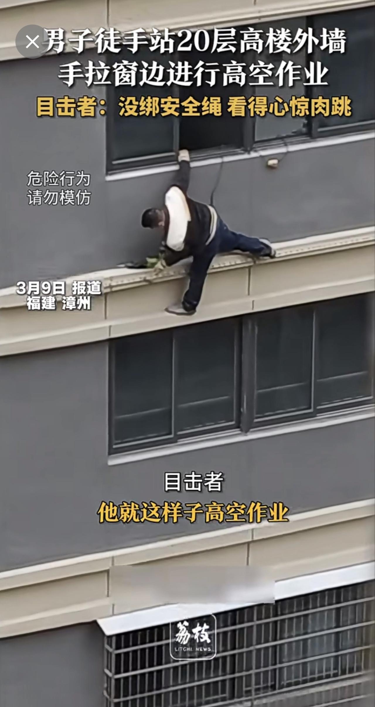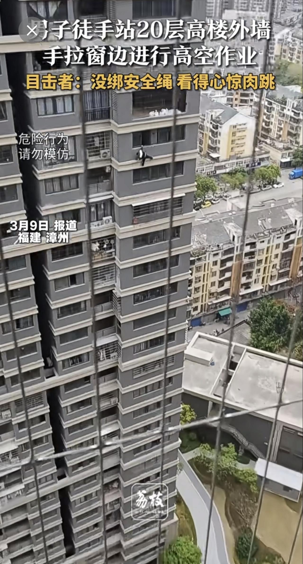 男子在20层高楼外墙进行高空作业,目击者称其未绑安全绳,场面让人看得心惊肉跳。高空作业安全绳 (新闻来源:荔枝新闻)