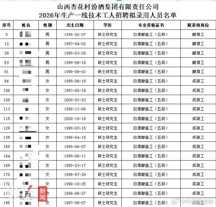 #汾酒一线岗位拟招聘硕士遭质疑# 【#汾酒回应多名硕士拟录为酿酒工成装工#】据纵览新闻报道,近日,山西杏花村汾酒集团有限责任公司(以下简称汾酒集团)公示了2026年生产一线技术工人招聘拟录用人员名单。名单中,酿酒工和成装工岗位拟录用人员中出现了10多名硕士研究生,引发关注。