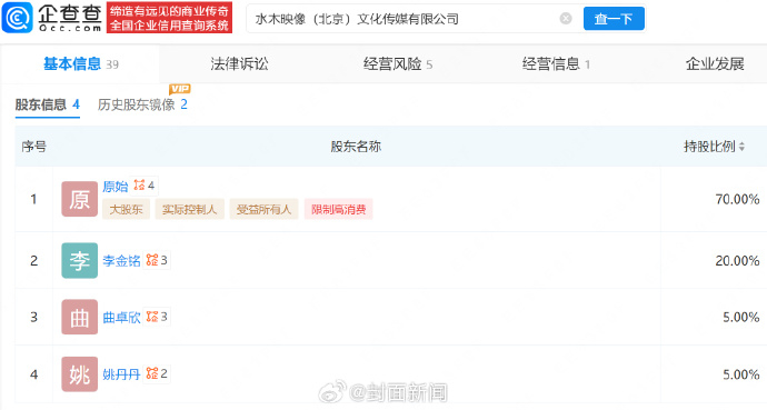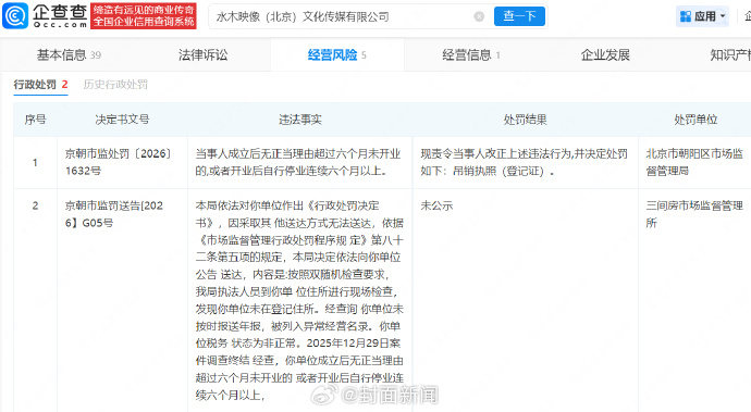 【#李金铭关联公司被吊销执照#】#李金铭关联公司多项违规被罚#企查查APP显示,近日,水木映像(北京)文化传媒有限公司新增两则行政处罚记录,违法事实显示,该公司因未在登记住所经营、未按时报送年报、税务状态为非正常,且成立后无正当理由超6个月未开业或自行连续停业超6个月,被责令改正并吊销执照(登记证)。该公司成立于2015年5月,注册资本为300万元,经营范围包含组织文化艺术交流活动、文艺创作、旅游信息咨询等,由原始、李金铭等人共同持股。(封面新闻)