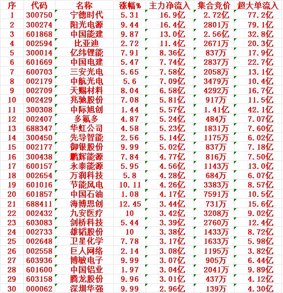 3月11日收盘,主力资金,已经大幅卖出的30名单: 中国西电:净流入 -21.8亿元 特变电工:净流入 -13.0亿元 烽火通信:净流入 -12.6亿元 润泽科技:净流入 -12.2亿元 网宿科技:净流入 -11.3亿元 航天发展:净流入 -9.73亿元 北方稀土:净流入 -9.72亿元 东阳光:净流入 -8.84亿元 协鑫集成:净流入 -8.19亿元 蓝色光标:净流入 -8.09亿元 天孚通信:净流入 -7.51亿元 东方电气:净流入 -7.47亿元 包钢股份:净流入 -7.12亿元 德明利:净流入 -7.09亿元 胜宏科技:净流入 -7.09亿元 3月11日收盘,主力资金“大幅买入”的30名单: 宁德时代:净流入 16.9亿元 阳光电源:净流入 16.4亿元 中国能建:净流入 13.0亿元 比亚迪:净流入 11.4亿元 亿纬锂能:净流入 8.36亿元 中国电建:净流入 7.74亿元 三安光电:净流入 7.58亿元 中航光电:净流入 7.09亿元 天赐材料:净流入 6.58亿元 兆驰股份:净流入 5.81亿元 中际旭创:净流入 5.57亿元 多氟多:净流入 5.24亿元 华虹公司:净流入 5.23亿元 先导智能:净流入 5.14亿元 御银股份:净流入 5.02亿元 鹏辉能源:净流入 4.77亿元 永泰能源:净流入 4.56亿元 万润科技:净流入 4.28亿元 节能风电:净流入 4.26亿元 中国石油:净流入 4.17亿元 海博思创:净流入 3.44亿元 九安医疗:净流入 3.42亿元 剑桥科技:净流入 3.39亿元 雄韬股份:净流入 3.38亿元 卫星化学:净流入 3.17亿元