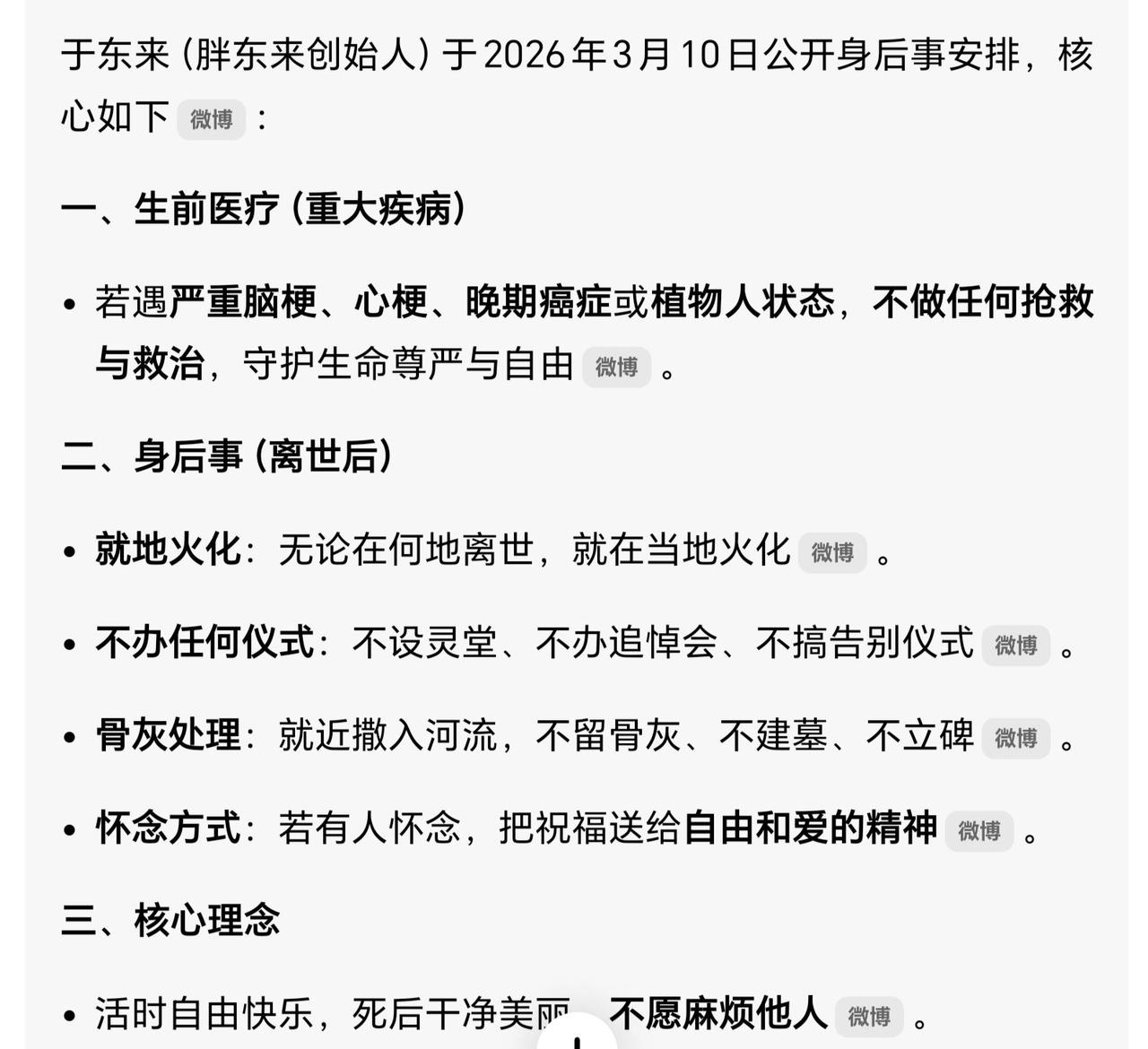 于东来最近交代后事,说不设灵堂不办仪式,骨灰撒河里,重病也不抢救。很多人说他通透,我倒觉得,这是他用一辈子活出来的“终极任性”。 他早年创业是拿命换钱,后来身体垮了做过胃癌手术,才彻底想明白:人折腾到最后,那些排场都是演给活人看的。与其躺在ICU插满管子,不如趁能动的时候活得带劲儿。他是把世俗那套“标准结局”给退货了——不想被丧葬礼仪绑架,也不想麻烦任何人。让骨灰回归自然,就是生命最后的裸奔。 你别觉得这是消极。他连企业传承都想好了,早早放权,不让儿子接班,定好六十岁必须退。他用制度告诉所有人:别迷恋个人,要传承的是自由和爱的精神。有些人活着已经死了,有些人交代后事都能让人觉得他还活着。于东来 于东来经营方式