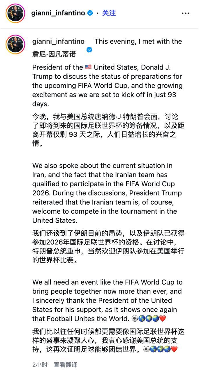FIFA掌门人詹尼·因凡蒂诺于深夜公开发布会面动态:他已同美利坚合众国总统特朗普进行会晤,特朗普当面再度表态——乐见伊朗代表队出战2026年美加墨联合主办的世界杯赛事。 早前英国《卫报》曾披露消息,倘若伊朗方面弃权,伊拉克将位列首位候补队伍,阿联酋同样存在递补可能。眼下这一不确定性暂时得以消除。 因凡蒂诺慨叹道:“当下较过往任何阶段都更需世界杯这类盛事凝聚全球民心,感激美方的鼎力相助,绿茵场确实能够消弭各类分歧。” 距2026年世界杯揭幕仅余93天,美伊这对宿敌或将在赛场之上正面相遇?