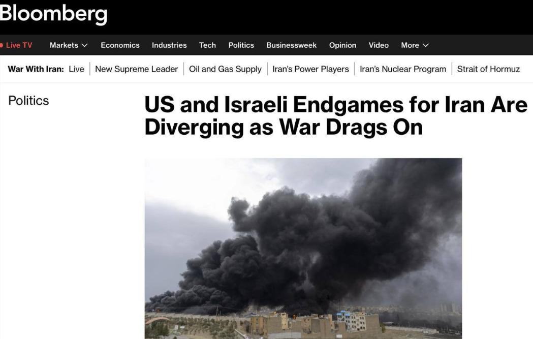 彭博社:随着战争拖延,美国与以色列在伊朗问题上立场出现分歧 以前大家都觉得这俩国家肯定步调一致,现在不一样了,这也让本来就乱的中东,变得更没谱了。 特朗普和以色列总理内塔尼亚胡,俩人公开说的话不一样,直接把分歧摆到了台面上,普通人一看就明白,他俩在这场仗上,想达到的目的、想结束的时间,差得老远。 美国总统特朗普,好几次公开说,美国对伊朗的军事目标,差不多已经完成了,这场仗大概率最近就能结束。 他说的道理很简单,美国和以色列一起,已经把伊朗的军事设施、导弹厂、飞机和军舰这些关键目标,都打得差不多了。 在美国看来,目的已经达到了,伊朗已经没多少能力反击了,没必要再打下去了。美国之所以急着停火,主要是自身压力太大:一是国内油价涨得厉害,老百姓开车、过日子都更贵了,很多人不满,给美国政府添了不少麻烦。 二是美国不想一直陷在中东这场仗里,耗钱耗人力,还耽误它在其他地方的计划,而且特朗普也明确说,不会派地面部队去伊朗,只想保住现在的成果,赶紧抽身。 和美国不一样,以色列总理内塔尼亚胡的态度特别硬,他明确说,他不觉得这场仗已经结束了。 以色列的目标不只是打伊朗的军事设施,而是要让伊朗老百姓摆脱现在的统治,说白了就是要换掉伊朗的现政权。 为啥以色列这么坚持?因为伊朗长期支持一些反对以色列的武装,这些人经常袭击以色列,直接威胁以色列人的安全。 在以色列看来,只打坏伊朗的武器,只能解决一时的麻烦,只要伊朗现政权还在,就会一直威胁自己,所以必须接着打。 最近以色列袭击伊朗的燃料储存设施,规模比美国预想的大很多,也让美国很不高兴,这也让两国的分歧彻底摆到了明面上。 虽然现在美国和以色列还嘴硬说团结,军队也还一起行动,没闹掰,但俩国的官员私下都承认,仗拖得越久,分歧就会越大。 其实这俩国合作,本来就是各算各的账,美国想的是维护自己在全球的地位,不想在中东耗太多成本;以色列想的是保住自己的安全,彻底除掉伊朗这个威胁。 两国的想法不一样,仗一打久,矛盾就暴露出来了,美国想停火止损,以色列想接着打,根本谈不到一起去。 他俩闹分歧,让中东的局势更乱了。一来仗不知道会怎么发展,美国想停、以色列想打,行动不统一,很可能越打越失控。 二来两国的同盟关系也出现了裂痕,中东其他国家也会跟着调整自己的做法,局势更复杂。 另外,仗打个不停,伊朗老百姓遭了罪,基础设施被打坏,日子过不好,而且油价一直涨,不光影响全球经济,咱们普通人过日子也会受影响。 说到底,不管是美国还是以色列,都是为了自己的利益。美国为了国内稳定和自己的全球计划,想赶紧停火;以色列为了自己的安全,想接着打。 现在两国还在表面上维持团结,但分歧已经压不住了。这场仗什么时候结束、怎么结束,就看他俩能不能谈妥。后续的情况,还得接着关注。