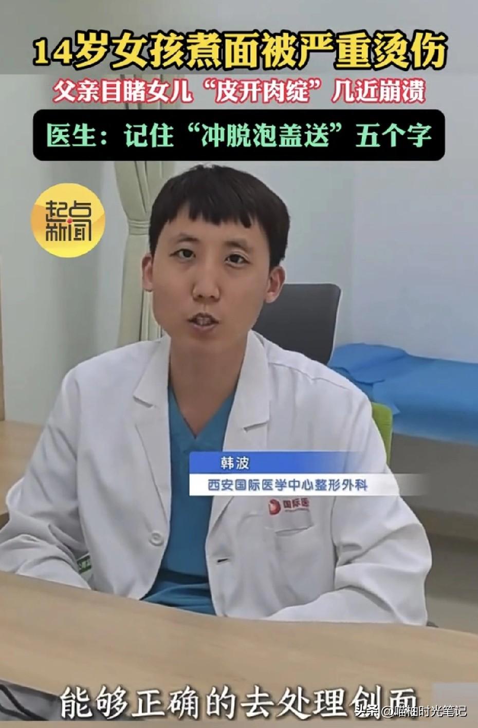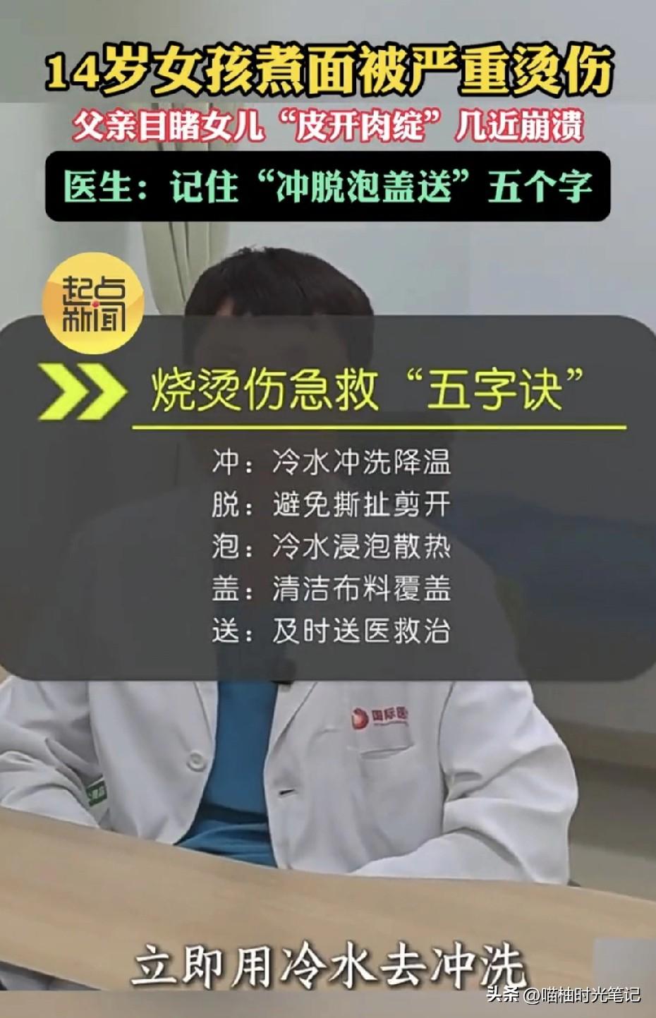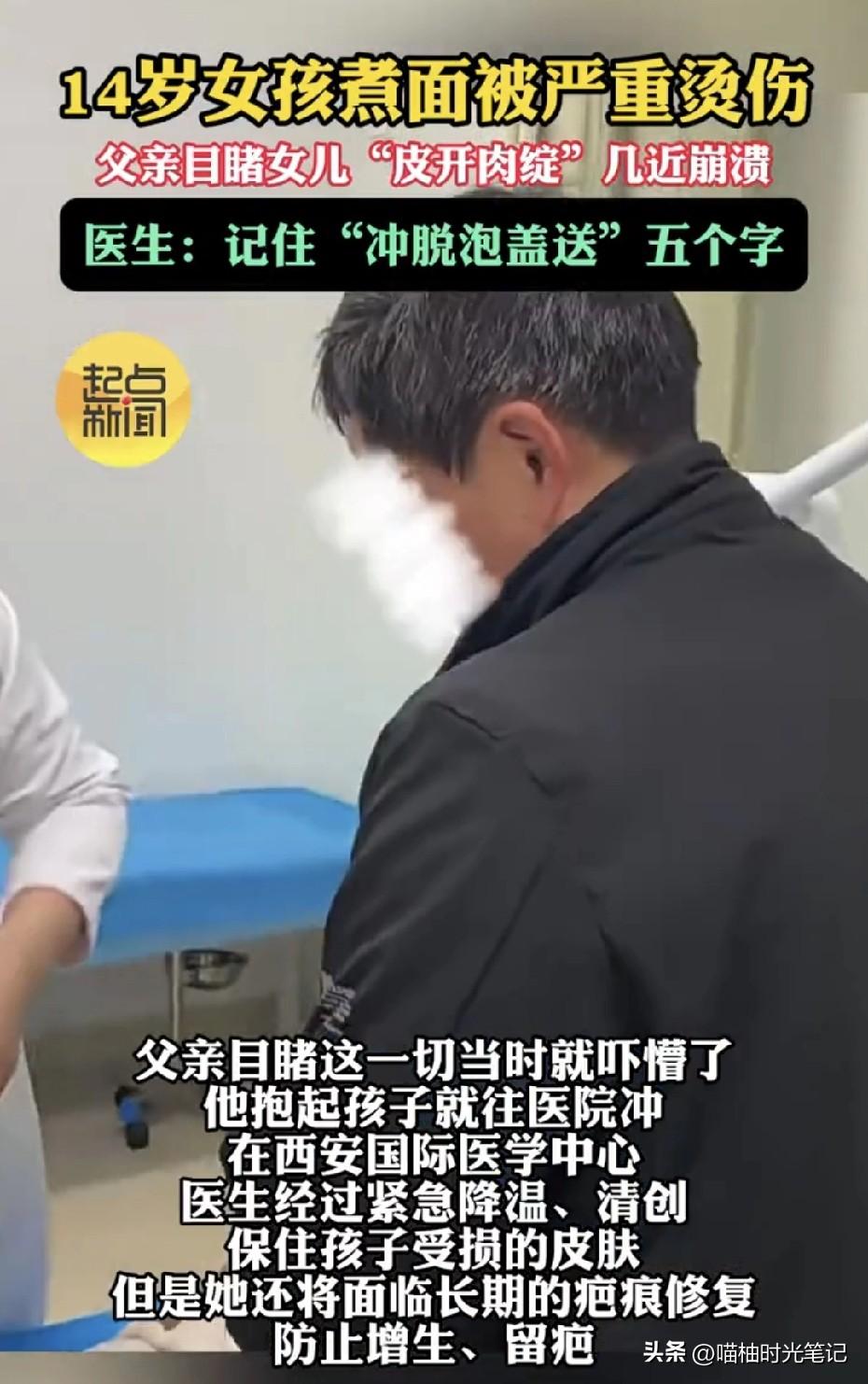 就在昨天,陕西西安的一户普通家庭,被一声尖叫彻底撕裂。 14岁女孩中午在家煮面,手一滑,整锅沸腾的面汤瞬间翻倒,滚烫的汤水直接浇在右侧脸颊、脖子、胸口。父亲目睹全过程,直接吓懵,抱起孩子就往医院狂奔。 医生诊断:浅二度加深二度烫伤。这意味着,女孩不仅要承受剜心之痛,还将面临漫长的疤痕修复战,甚至终身留下增生性疤痕。 这不是什么"熊孩子作死"的剧情,而是一个普通到不能再普通的午后:孩子饿了,自己煮碗面吃,结果命运开了个残酷的玩笑。 医生表示:"如果当时第一时间冲冷水,深二度可能变成浅二度。" 冲、脱、泡、盖、送,这五个字,本可以改写结局。但慌乱中,父亲选择了"抱起就往医院冲",错过了黄金急救时间。 我们总在说"孩子要独立",14岁煮碗面不过分吧,但谁教过她,汤锅手柄朝哪个方向最安全?谁提醒过她,灶台边缘不能放重物?更重要的是,当意外发生,全家居然没人知道"先冲水再送医"这个基本操作。这不是个例。随手一搜,全是血淋淋的教训。 这位父亲的"崩溃"该成为一记警钟。我们给孩子的"独立",不该是"放养式冒险",而必须是"安全框架内的自由"。 煮面可以,但请先教她:热锅手柄朝内、烫伤立即冲水15分钟、不要轻信偏方抹酱油。这些才是"独立"的底线。 最后小编愿孩子早日康复! ———🌱——— 「本文信源基于起点新闻公开报道,旨在普及烫伤急救知识,不构成医疗建议。如遇烫伤,请立即拨打120或前往正规医院就诊,切勿自行处理延误病情。」