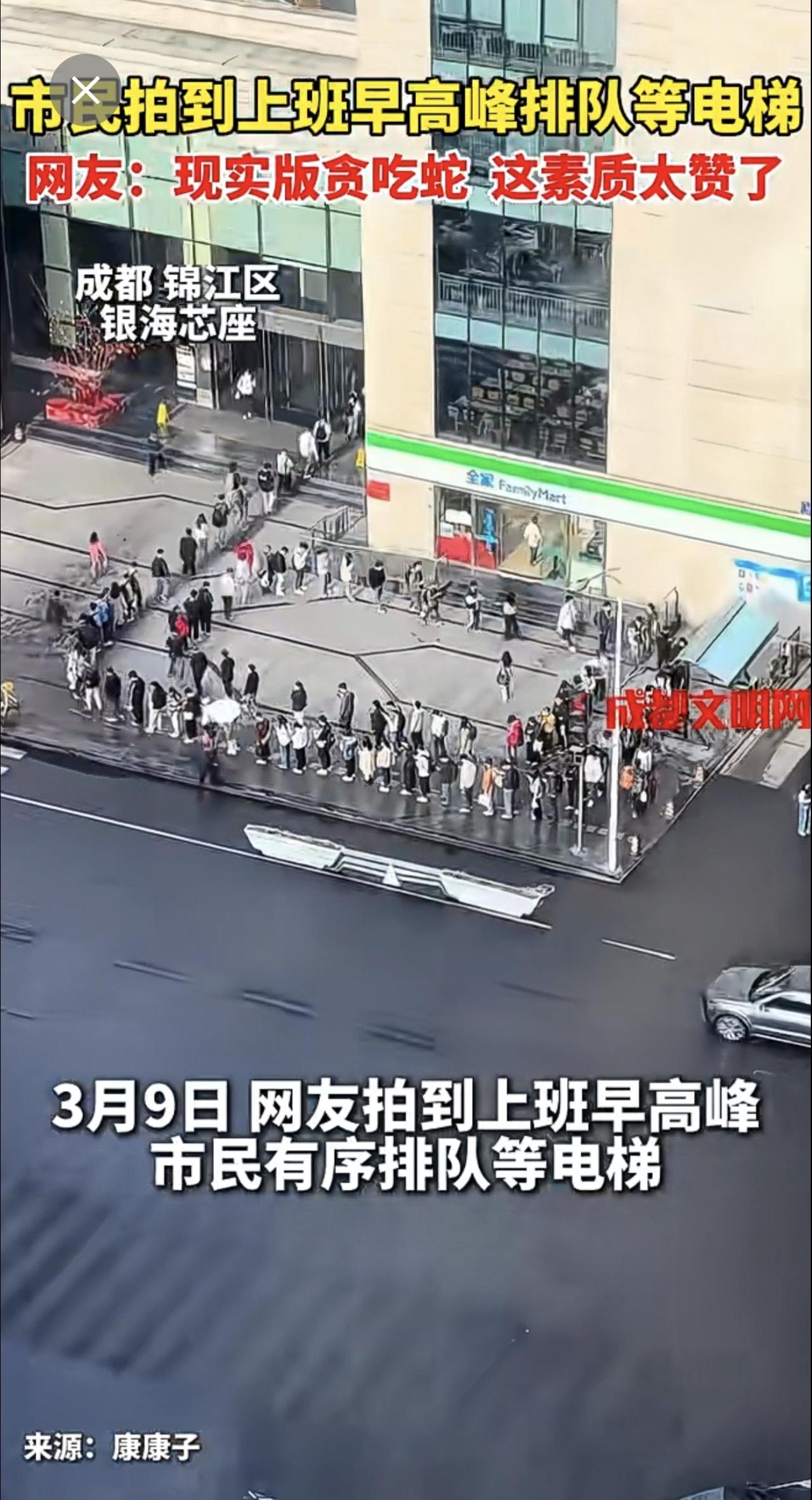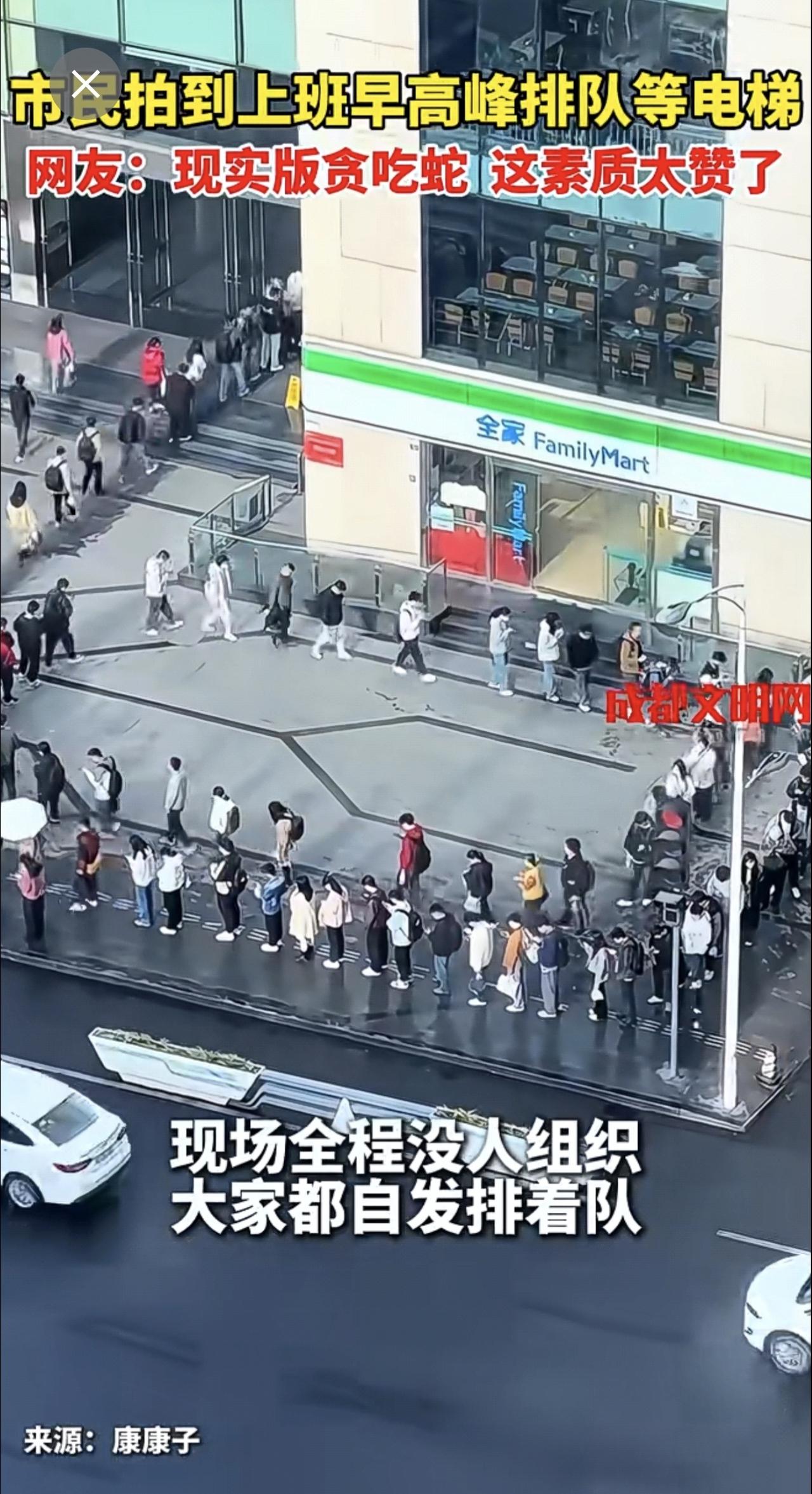 市民拍到上班早高峰排队等电梯,现场全程没人组织,大家都自发排着队,网友:现实版贪吃蛇 这素质太赞了。 成都 暖心一幕