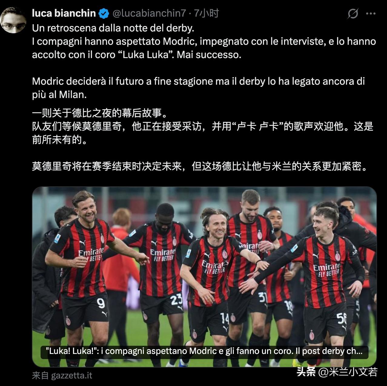 莫德里奇在米兰球员中威望无人能及!米兰德比之战结束后,所有球员都在更衣室等待莫德里奇到来,莫德里奇来到更衣室后,队员才开始庆祝德比胜利。 之前有消息说皇家马德里俱乐部本赛季之所以更衣室山头林立就是因为莫德里奇离开,莫德里奇离开后皇家马德里俱乐部没有人可以像莫德里奇那样以德服人,各个山头话事人彼此都不服气,所以皇家马德里俱乐部内耗严重下才会出现问题,龙哥就是背锅的,如果莫德里奇还在皇家马德里也许龙哥在皇家马德里俱乐部会是不同的结果。 尊重永远不是停留在口头上,而是行动上,大家如果不是内心对莫德里奇充满敬意,大家不可能不约而同选择等待莫德里奇,有这样的行为就说明了大家对莫德里奇的尊重是由内而外的。比如我们董事长,他每次开会时候我们都表示董事长高瞻远瞩,但大家眼睛看的都是董事长秘书,意思显而易见,我们没拿我们董事长当人。
