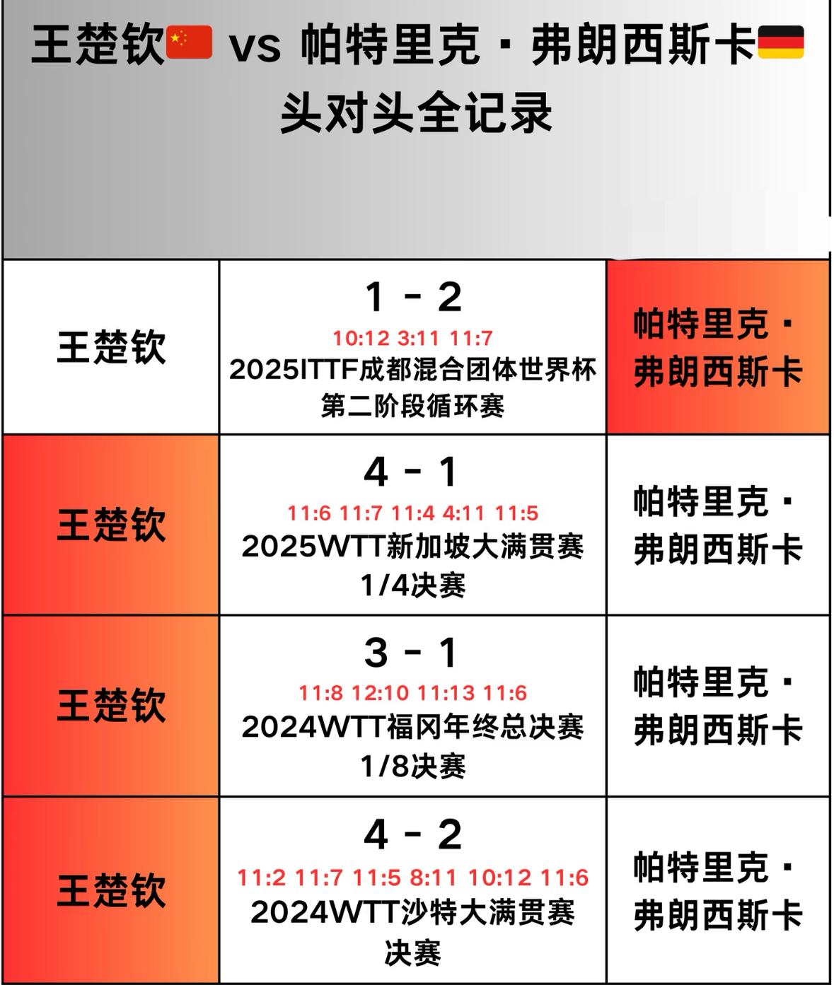 王楚钦与弗朗西斯卡的头对头全记录—重庆冠军赛男单1/8对阵 王楚钦VS弗朗西斯卡, 3月11日,WTT重庆冠军赛,男单 1/16决赛中, 王楚钦3:0格罗特,晋级男单16强, 弗朗西斯卡3:0大勒布伦,晋级16强!11:9,11:7,11:8, 下一场1/8决赛, 王楚钦再战弗朗西斯卡, 从两个人的交手记录来看, 王楚钦对弗朗西斯卡保持 三胜一负的战绩。 两个人的最近一次交手是在 成都混团的第二阶段, 当时王楚钦1:2弗朗西斯卡, 这也不能算输, 因为这是团体赛,赛制 就是打三局, 大赛前王楚钦遇到强敌不是 坏事,提前熟悉一下, 为世界杯和世乒赛做准备, 每一场比赛都是新的开始, 敬畏每一位对手, 加油王楚钦!