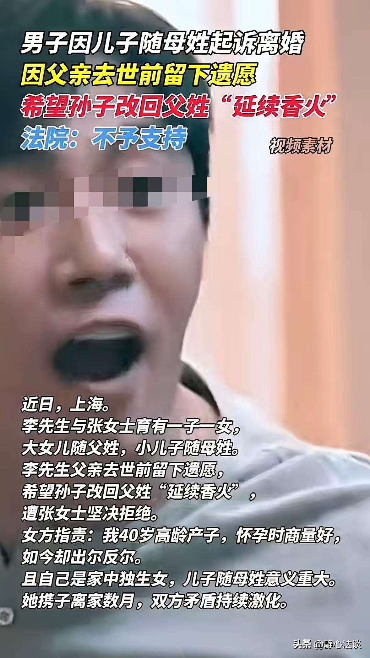这是一个典型的家庭伦理和法律问题交织的案例,反映了传统观念与现代法律意识、夫妻感情之间的复杂矛盾。 从法律角度看,根据《民法典》第1015条,自然人可以随父姓或母姓,且父母双方对孩子的姓氏享有平等决定权,并不存在强制必须随父姓的规定。孩子跟母姓,且是夫妻双方此前达成的协商结果,法律上是有效且受保护的。老人的遗愿虽然情感上有分量,但没有法律强制执行力,不能单方面推翻已有的名字安排。 从情感和家庭关系角度,张女士在怀孕生子过程中付出了巨大身体和心理代价,她希望孩子能够跟随自己的姓氏,实现了自己的心愿。这不仅是对她个人尊重的体现,也关乎夫妻双方的平等与信任。而李先生因父亲的遗愿提出必须改姓,并以“传宗接代”为由强硬要求,导致夫妻关系紧张,甚至发展到离婚危机,说明他在这件事上的态度过于刚愎自用,忽视了妻子的感受和夫妻间的承诺。 两代人在姓氏观念上的冲突,实质上是传统与现代价值观的碰撞。姓氏当然有文化和血缘传承的象征意义,但比起一个温暖、互相尊重、沟通顺畅的家庭环境来说,单纯的姓氏更显得次要。婚姻和家庭的核心是爱与支持,而非一个姓氏的归属。 综上所述,维护一个完整和谐的家庭,尊重夫妻双方的决定和承诺,更有助于孩子的健康成长和家庭幸福。为一个姓氏而撕裂家庭,得不偿失。李先生应当宽容理解妻子,重新建立信任,而非以遗愿作为施压工具。只有这样,家庭才能真正实现团结与温暖。 如果你想,我可以帮你梳理一份处理类似家庭矛盾的沟通建议或法律解读。婚姻法律意识 婚姻伦理观