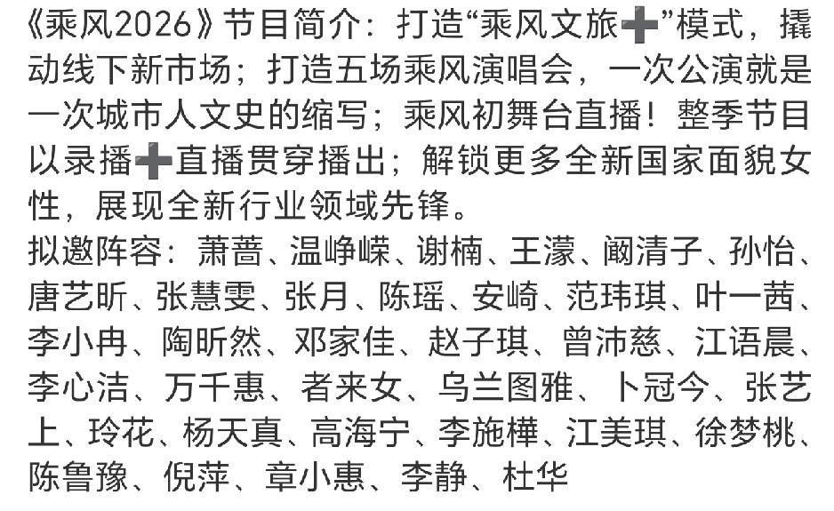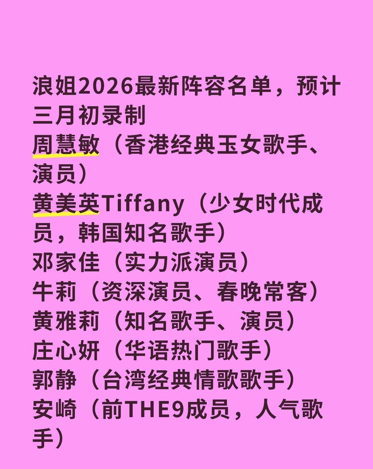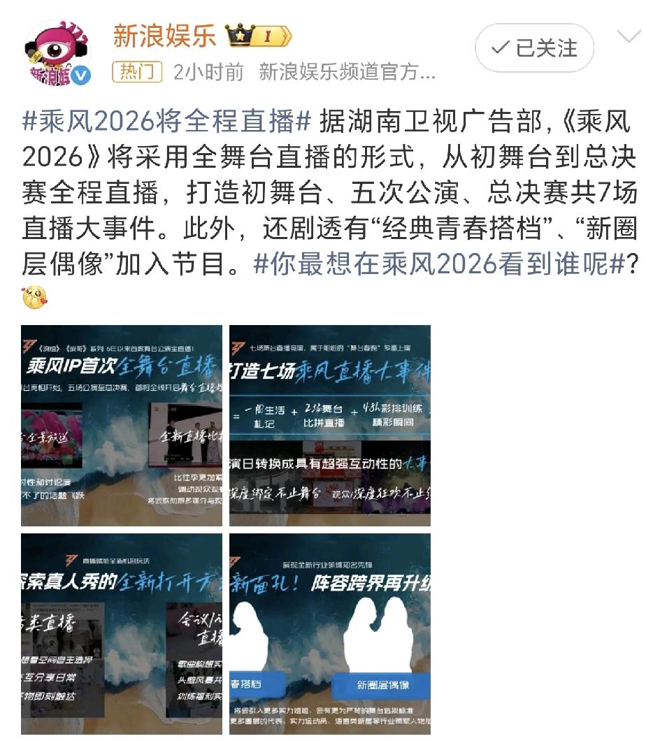 浪姐要开直播了,这真是一个又惊又喜的消息,芒果台真是胆大会搞事情! 上一届的披哥和浪姐都扑的悄无声息,今年的浪姐马上拿出魄力了,从初舞台到五次公演再到总决赛七场全部直播,看到这里不得不为今年参加的姐姐们竖个大拇哥了,真是好样的! 看看今年都有哪些姐姐们来了! 明显的演员阵容大于歌手,也没有绝对的大咖,至于名单中的最后陈鲁豫,倪萍,章小蕙,李静,杜华,应该是没有可能吧[捂脸]! 萧蔷,唐艺昕,范玮琪,叶一茜,李小冉,赵子琪,邓家佳这几位都像是真的,都曾经小火过,已经很久没露面了! 如果没官宣直播,真的一点也没想起来浪姐就要开始录制了,现在直播的消息传出来,还真得吸引了一大波眼球,直播有瓜,直播好看[笑哭]! 看看到底哪位浪姐能扛住直播的魔力!浪姐