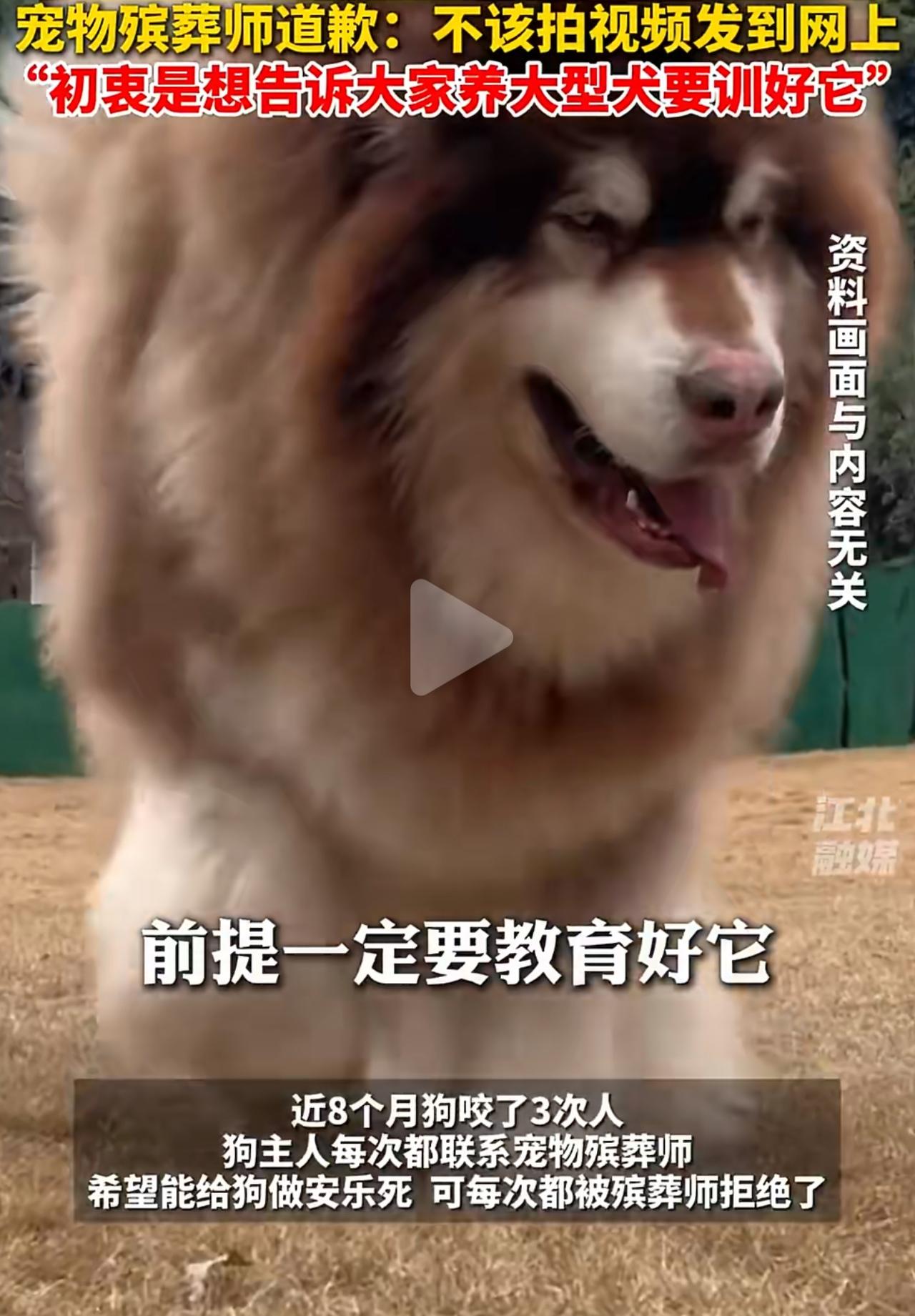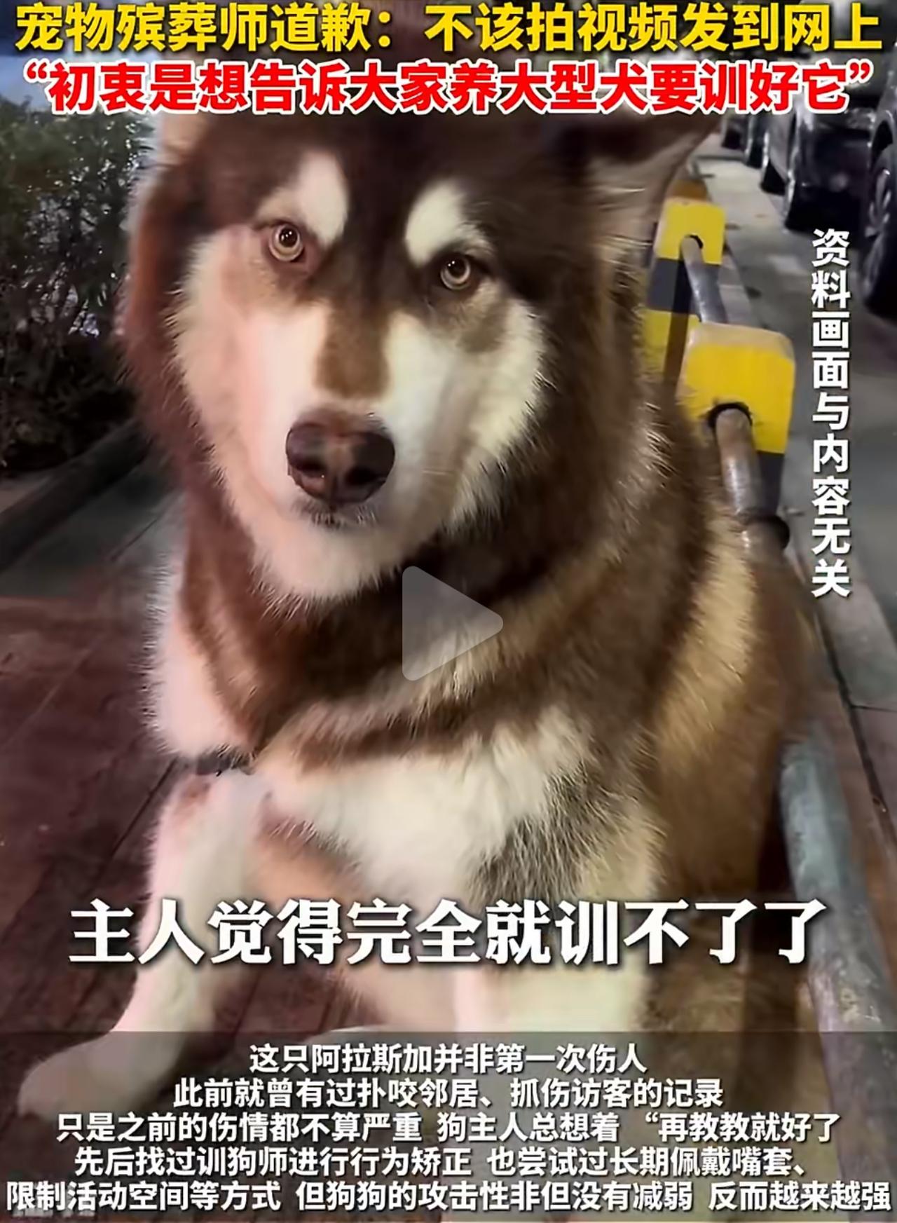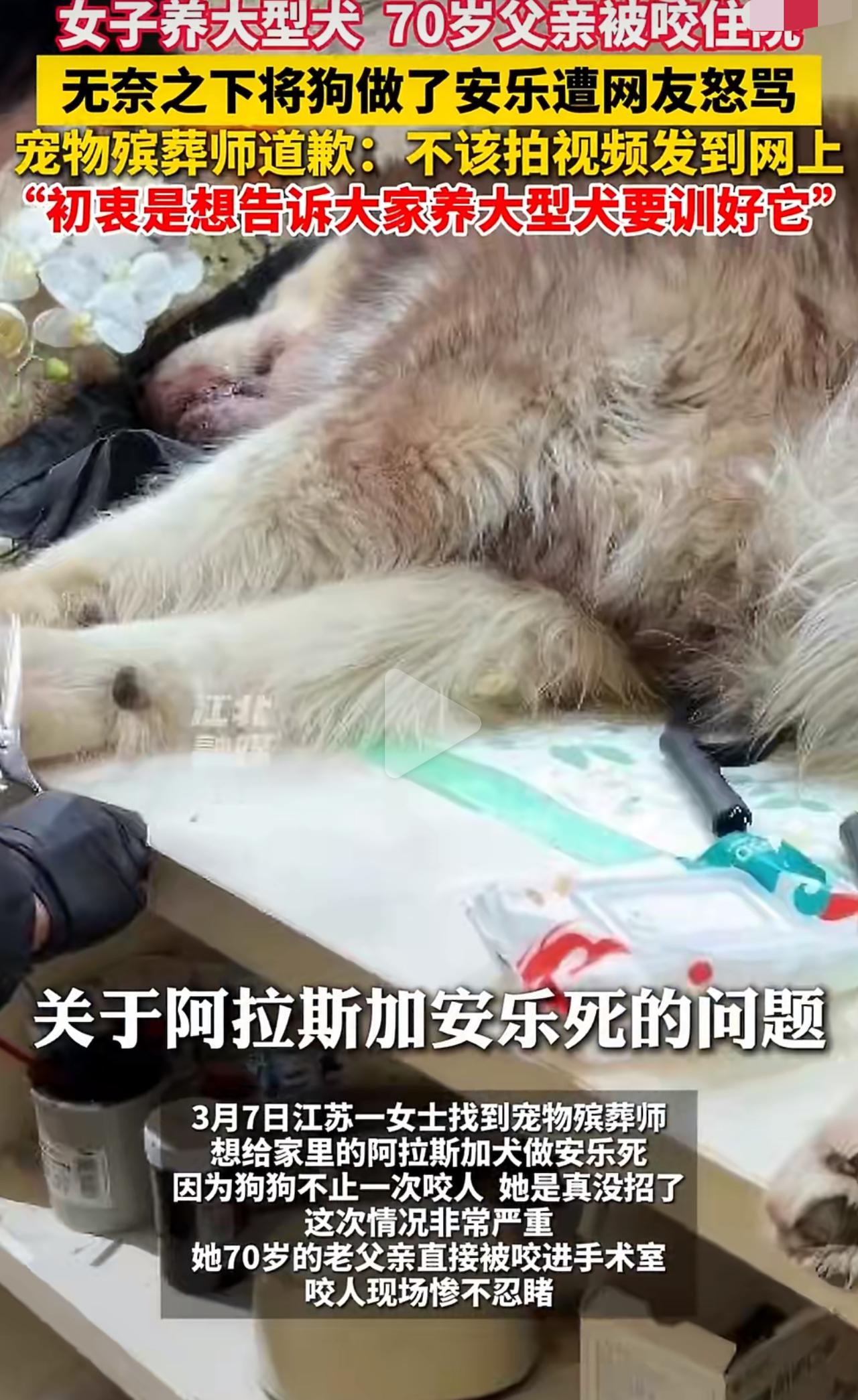养大型犬真的能把人逼到崩溃边缘,江苏这位女士的事,看完心里特别不是滋味。 她家那只一百多斤的阿拉斯加,从小就有咬人的毛病,短短八个月里接连伤了三个人。她能做的都做了,找训犬师、天天戴嘴套、严格限制活动范围,可狗的攻击性一点没减,反而越来越凶。 她一直抱着侥幸,总觉得再等等、再教教就好了,直到3月7号,狗直接扑向她七十岁的父亲,把老人咬得浑身是伤,脸上缝了十针,直接送进医院做手术。 那一刻她才彻底清醒,再留着这条狗,迟早要出人命。 她反复联系、坚持要求安乐死,好不容易才办成。可狗体型太大,打了两针镇静剂都没用,她只能含着泪亲自安抚,亲手送走陪伴多年的狗。 本来就是走投无路的无奈选择,结果殡葬师把整个过程拍下来发出去,她瞬间被网友网暴,骂她冷血、骂她不负责任。 一边是重伤住院的父亲,一边是铺天盖地的指责,她的委屈和煎熬,外人根本体会不到。 有人站着说话不腰疼,说她早该处理,可只有养过这种烈性大型犬的人才知道,想安乐死有多难、求助无门有多绝望。 明明当地禁养大型犬,监管却没跟上,伤人犬的处理标准也模糊,最后所有压力都压在主人身上,逼着她在亲情和宠物之间做最残忍的决定。 喜欢狗没问题,但养犬必须守规矩、负责任,安全永远是第一位,别等悲剧发生,才知道后悔。禁烈性犬 城市烈性犬 禁养烈性犬新规
