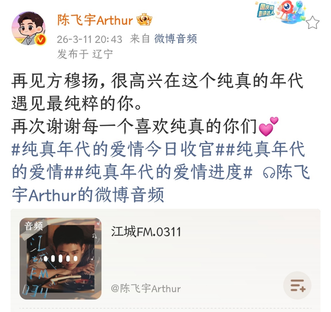 陈飞宇发电台告别方穆扬收官不意味着忘记,而是把一段美好的记忆打包收藏。谢谢阿瑟,用这样一个温柔的电台,帮我们完成了这个动作。 陈飞宇发文感谢观众