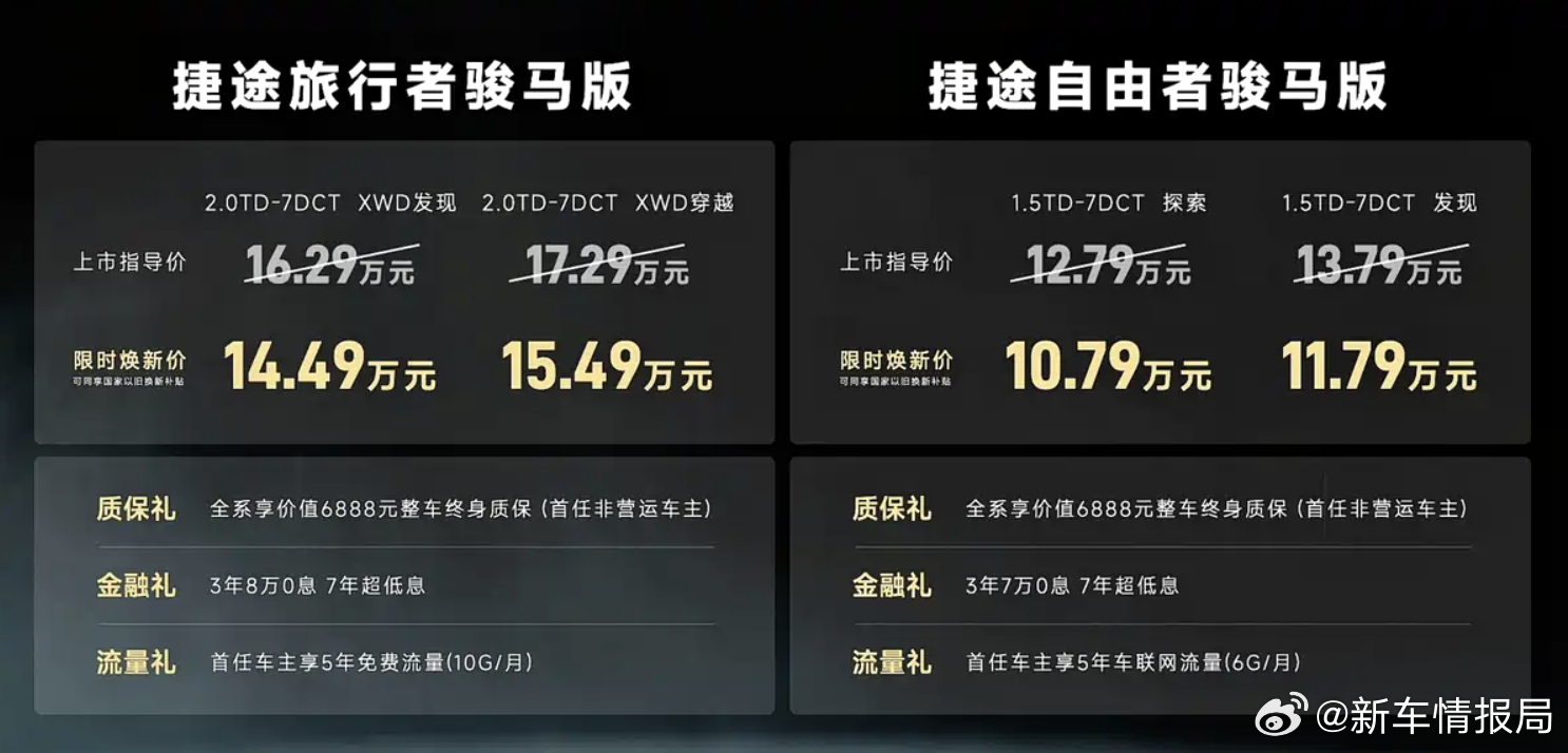 其中捷途自由者骏马版共推出2款车型,指导售价为12.79-13.79万元,限时焕新价10.79-11.79万元;捷途旅行者骏马版共推出2款车型,指导售价为16.29-17.29万元,限时焕新价14.49-15.49万元。