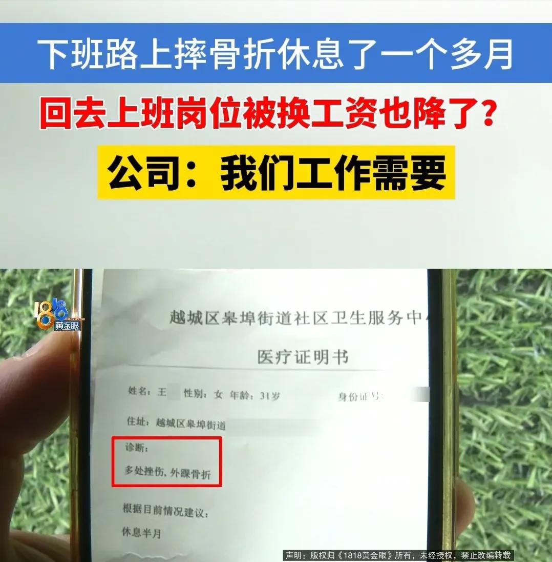 浙江绍兴,女子在下班的路上摔骨折了,在家里休养了一个多月,她担心这么休息下去,工作不保,就拄着拐杖去上班,结果公司不但给她换了岗位,还给她降薪了,工资只有2430元,女子不肯,就要求领失业金,公司却不配合。 女子姓王,在一家连锁超市总部上班。 她原来的岗位是助理,日常工作主要是填表格、做物料采购、整理数据。 工作节奏不算紧张,有时还会加班,加班费加在一起,一个月收入基本能够覆盖生活。 这份工作她做得顺手,也一直比较珍惜。 意外发生在一次普通的下班路上。 那天她走在回家的路上,不小心摔了一跤,结果直接伤到了腿部,去医院检查后确定是骨折。 医生建议好好休养,短时间内尽量少走动。 这一休养就是一个多月。 腿伤恢复得并不理想,走路仍然需要依靠拐杖。 家里人劝她多休息,可她心里始终放不下工作。 现在很多岗位竞争激烈,一旦离开太久,很容易被人顶替。 她越想越不踏实。 身体稍微能下床活动后,她就决定提前回公司。 那天她拄着拐杖,一步一步走进办公室。 本来以为能继续原来的岗位,却很快发现情况已经变了。 公司把她调去了财务部门。 新的工作内容明显轻松,基本只需要按照正常工作日上班。 没有加班,也没有额外补贴。 工资只有2430元。 在当地生活,这个数字确实不高。 房租、水电、日常开销加起来,很难剩下多少。 王某一时难以接受。 她找到公司管理人员询问原因。 公司方面给出的解释比较简单,称这是岗位安排上的需要。 公司还提到,她原先所在的助理岗位原本有两个人。 她休养期间,另一名助理已经能独立完成工作。 岗位需求随之减少。 公司认为再安排她回去,已经没有合适的位置。 因此给她安排到财务部门。 工作地点没有变化,仍然在同一办公室。 只是岗位不同,工作量也减少。 王某听完之后更加失落。 她渐渐意识到,这种安排可能是在暗示她离开。 收入骤降之后,她很难继续维持原来的生活。 考虑一段时间后,她决定离开公司。 她没有提出赔偿要求,只希望公司能配合办理相关手续。 原因很简单。 只要公司按照规定办理离职证明,她就可以申请失业保险金。 这样在养伤和找工作的过渡阶段,至少还有一笔基本保障。 事情却没有想象中顺利。 公司并没有立刻配合办理。 王某多次沟通后依然没有进展。 无奈之下,她只好寻求调解。 调解人员介入之后,公司表示可以沟通。 前提是双方达成一致协议。 只有在协议签署之后,公司才会配合办理相关手续。 王某对此十分谨慎。 她担心协议里可能会涉及放弃其他权益。 如果贸然签字,未来再维权就会变得困难。 事情一时间陷入僵局。 从法律角度看,劳动合同内容发生变化,需要双方协商一致。 岗位调整如果直接影响工资待遇,也需要双方同意。 另一条规定同样明确。 用人单位在解除劳动关系后,应当出具相关证明,并告知员工享受失业保险待遇的权利。 这些程序通常需要在规定时间内完成。 如果单位没有履行义务,劳动者可以向人社部门投诉。 还有一个问题也被不少人提到。 王某是在下班路上受伤。 如果事故责任并非由她本人造成,在某些情况下可能被认定为工伤。 不过具体是否符合条件,需要根据实际情况进行认定。 目前王某还在考虑是否继续协商。 她一方面希望事情能尽快解决,另一方面也担心权益受损。 不少打工人看到这件事时,都提到一个细节。 一个腿部骨折的人,拄着拐杖回到办公室。 她想保住一份工作。 现实却让她不得不重新规划下一步。 工作关系结束之后,办理离职手续和社保衔接往往很重要。 很多人并不了解流程,容易在细节上吃亏。 遇到类似情况,及时咨询专业机构或相关部门,往往比单独沟通更有效。 王某的腿还没有完全恢复。 她现在最希望的是把手续处理清楚,再安心养伤。 至于下一份工作,只能等身体恢复之后再慢慢寻找。