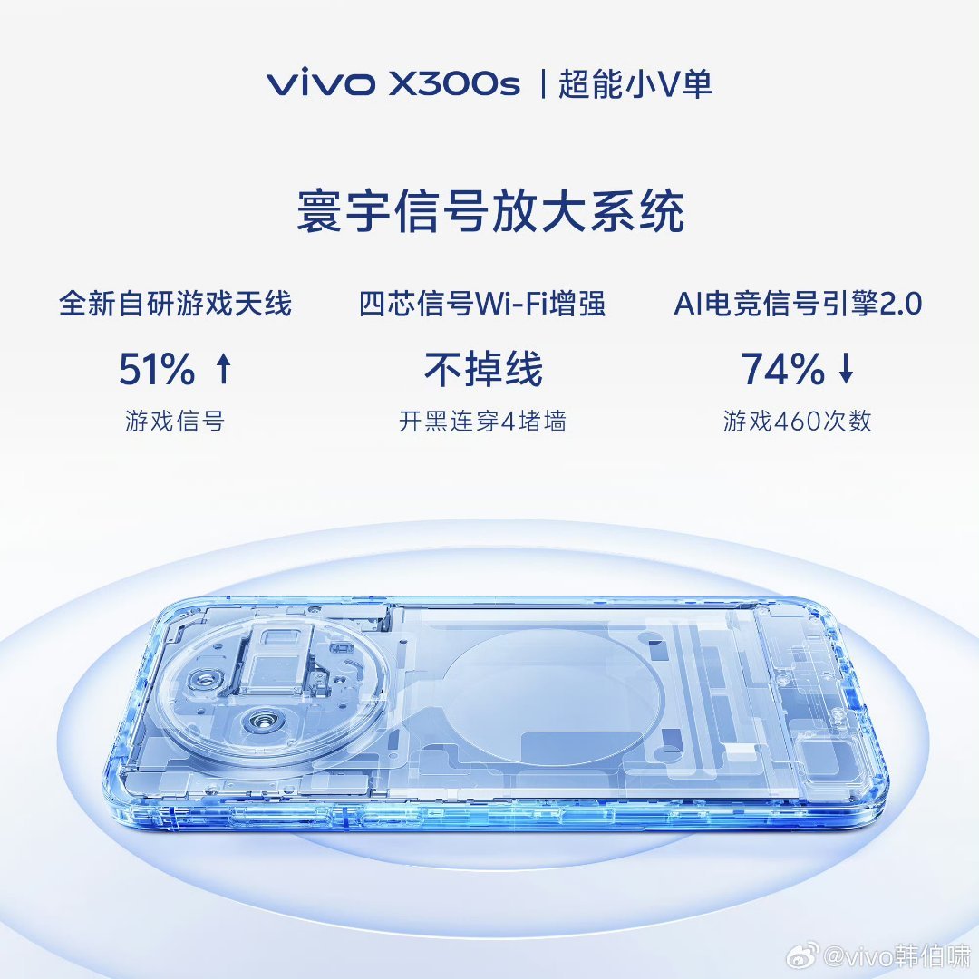 该机还内置 7000mAh级容量电池,配备 90W 快充头,还拥有 751440 X 轴马达 + 1511 对称双扬声器 + 3D 超声波指纹等配置,支持IP68/IP69 防护等。vivo X300s 还有“移植”蓝厂最强性能电竞体验全家桶,含 Monster 超核引擎、寰宇信号放大系统等。vivo X300s