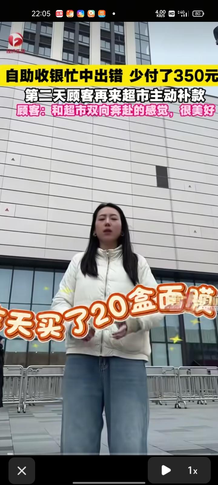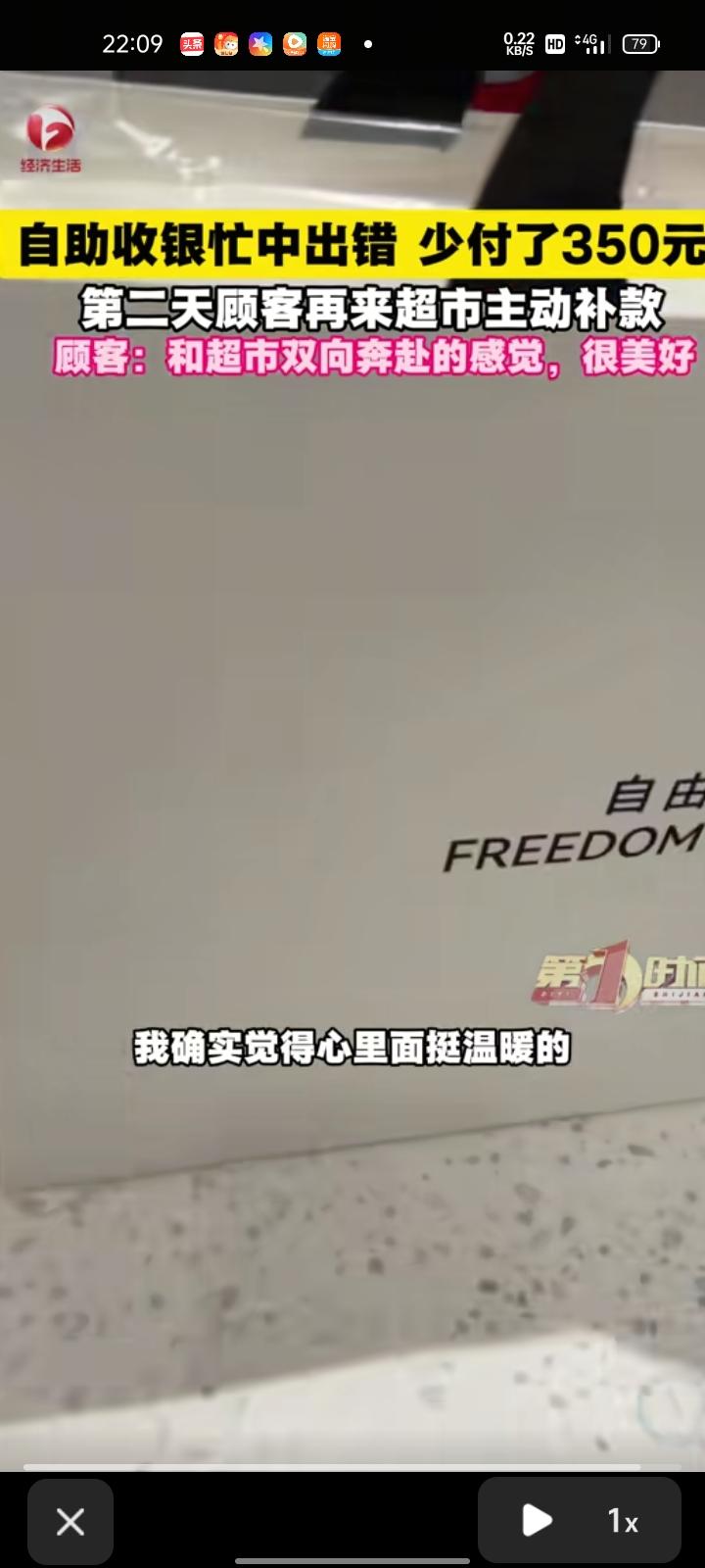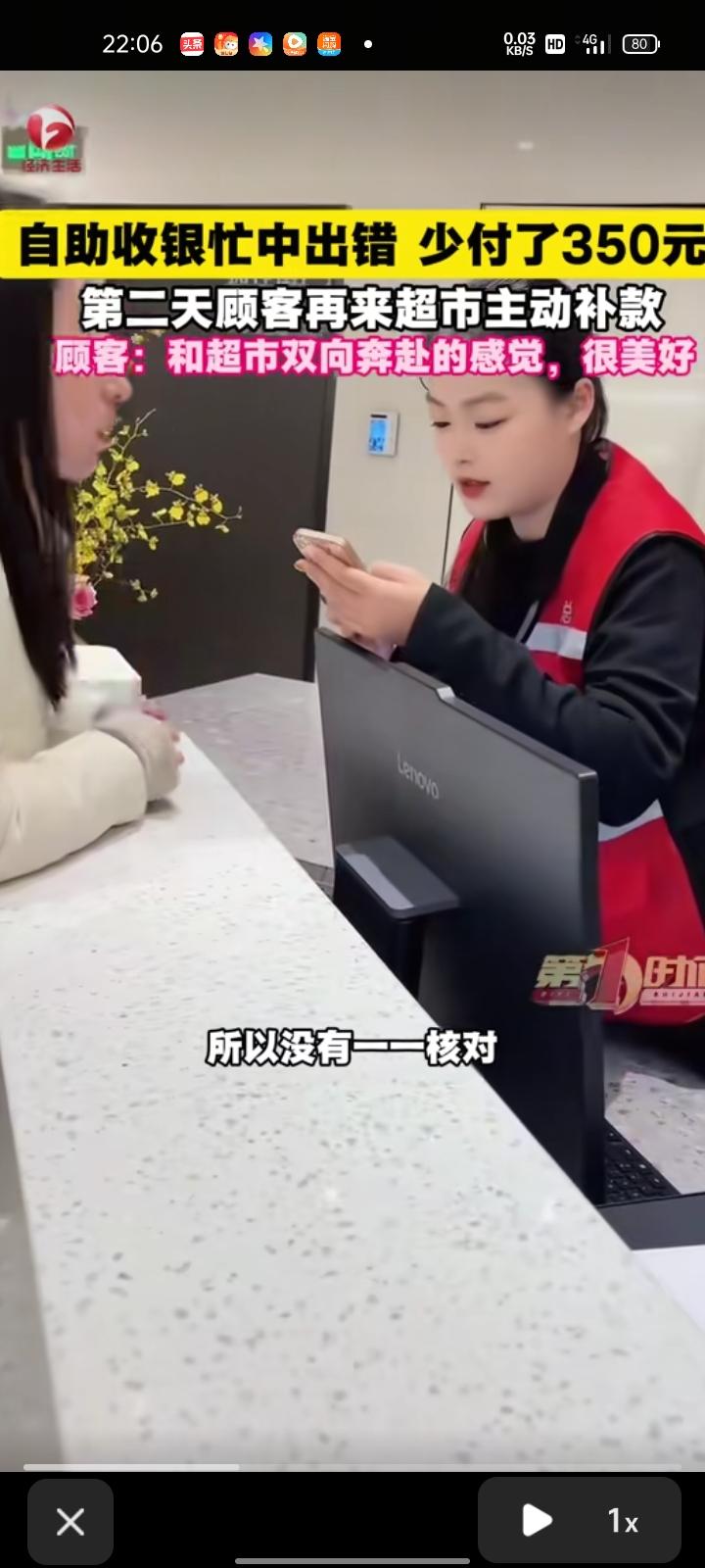 3月6日,河南新乡。女子去超市买22盒面膜,因自助收银时忙中出错,少付了350元。次日,女子就去超市服务总台跟他们说明情况,把少收的钱给补上了,服务台的人非常感谢她,还给她送礼品,双向奔赴具象化了