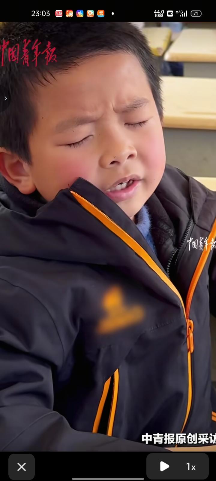 3月10日,昭通市永善县。开学第一节课,小孩哥全神贯注,闭着眼睛背书,已经开始“卷”起来。 朱老师表示,被他背书的样子给逗笑了,他是班里的英语课代表,上学期期末考了100分。