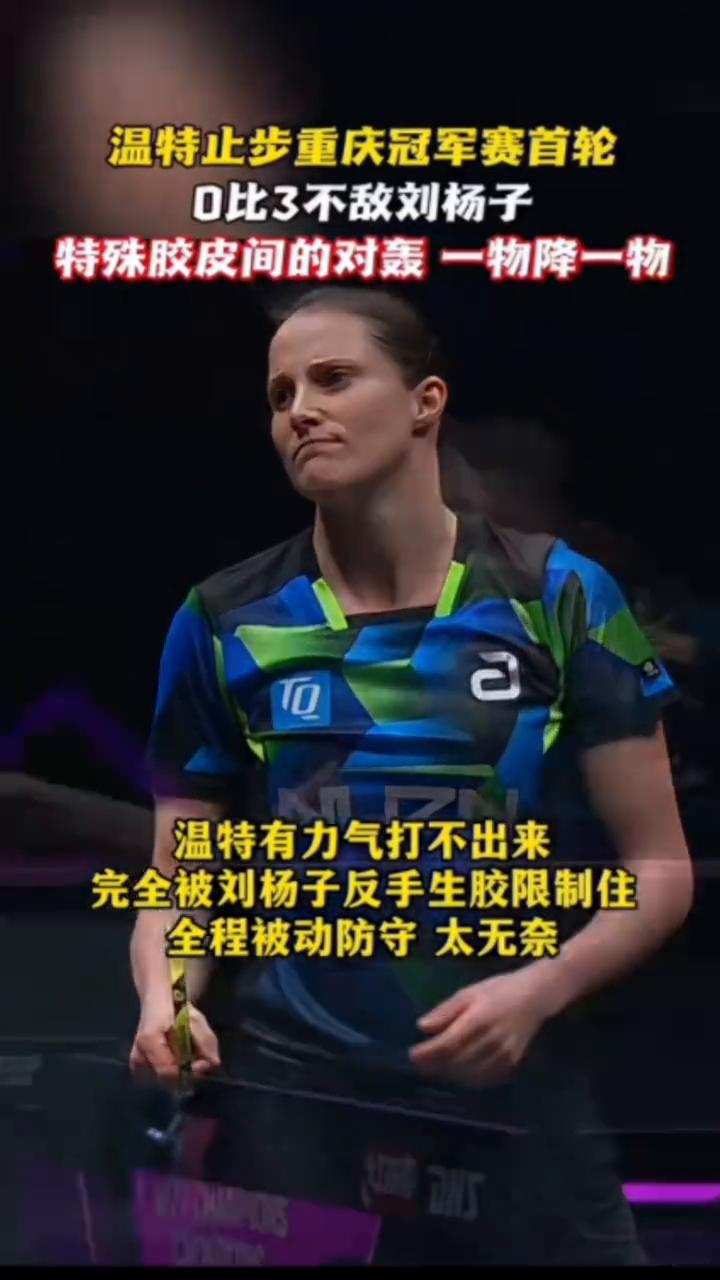 温特止步重庆冠军赛首轮,0比3不敌刘杨子。 特殊胶皮间的对轰一物降一物,温特有力气打不出来,完全被刘杨子反手生胶限制住,全程被动防守太无奈。杨子的临场变化能力强,让对手极其不适应。特殊打法生胶不吃防弧的转,打法的完全克制。 温特33岁近期发挥出色,世界排名已经上升至了11位。对阵生胶防孤的效果发挥不出来,完全发挥出了颗粒打法的特性。赛前做好了充足的准备,打得太聪明了。下一轮将对阵王艺迪,祝贺刘杨子战胜强敌晋级下一轮,开心的举起拳头庆祝。
