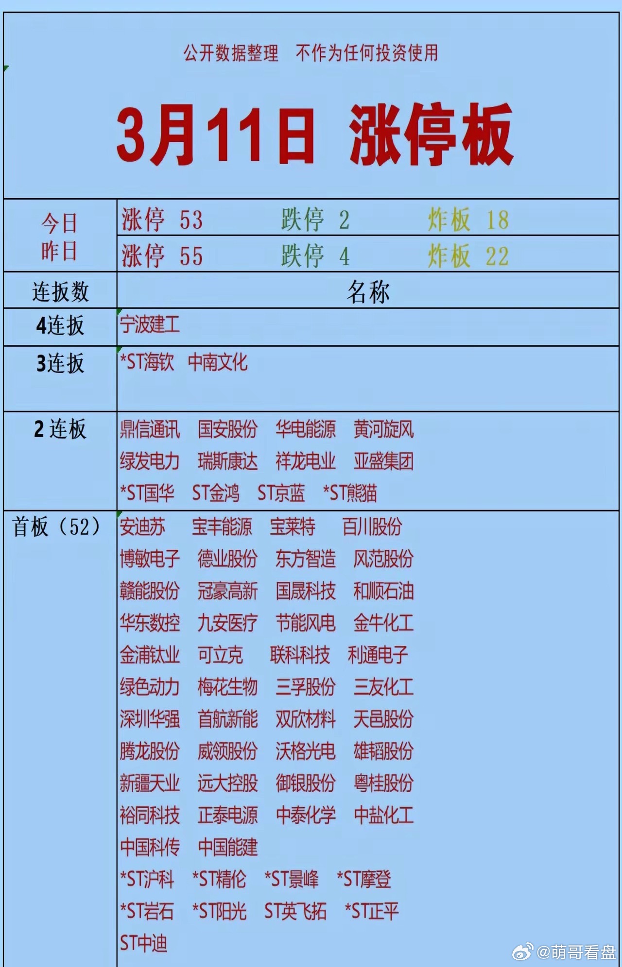 3月11日 A股涨停复盘:市场情绪小幅回落,今日涨停53家、跌停2家,炸板率回落至18家。连板梯队方面,宁波建工晋级4连板成高度龙头,ST海钦、中南文化斩获3连板,鼎信通讯、国安股份等多股晋级2连板,短线情绪仍处活跃区间。首板阵营扩容至52家,覆盖新能源、基建、电子等方向,资金聚焦低位补涨,需警惕高位分化风险。以上个人观点仅供参考