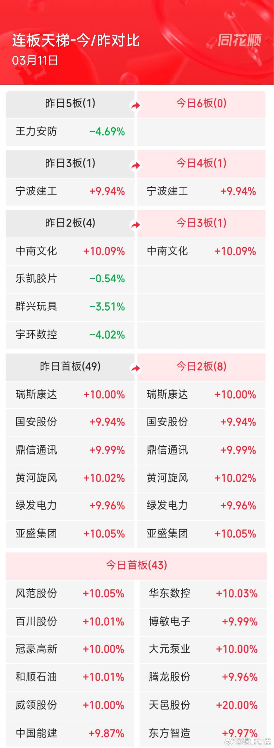 3月11日,涨停复盘(67只),主要包括电池、电力电网、化工板块。1、四连板:宁波建工2、三连板:中南文化3、二连板:国安股份、鼎信通讯、瑞斯康达、黄河旋风、亚盛集团、华电能源、绿发电力、祥龙电业4、首板:百川股份、中国能建、和顺石油、东方智造、御银股份、国晟科技、金牛化工、三友化工、中盐化工、金浦钛业、赣能股份、中国科传等