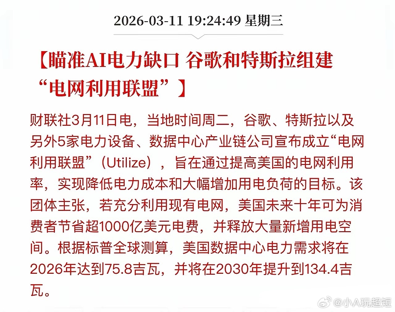6大巨头联合出新招!靠“软技术”盘活万亿电网,电力数字化运营来了!美东时间3月10日, 谷歌、特斯拉拉上6家巨头成立电网利用联盟,直接对美国传统电力模式开炮!他们的结论惊掉下巴:美国电网不是缺电,是“太懒”!现有电网为极短的高峰期设计,90%的时间都在“摸鱼”。联盟放话:只要用对技术,未来10年能节省1000亿美元。逻辑彻底反转:以前是缺什么建什么,现在是把闲置的容量逼出来!数据中心耗电如虎,与其苦等新建电网,不如立刻激活沉睡资源。二大掘金主线已浮出水面,电池储能——谷电充电、峰电放电,平抑波动的核心利器!虚拟电厂——把分散的空调、电动车聚合成端电厂,无需新建即可调峰。电力提效比扩建更紧迫、更暴利,6家巨头已经出手,你还等什么?