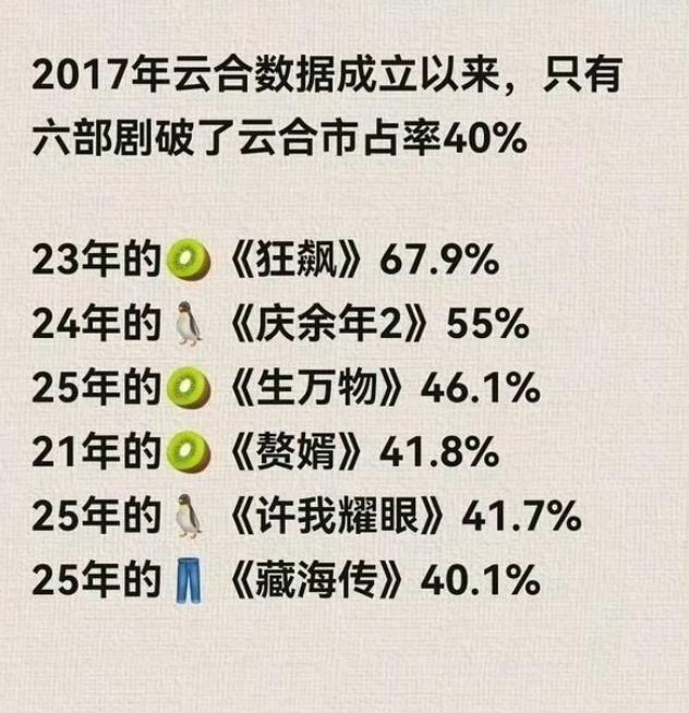 《逐玉》云合占比破40% 《逐玉》开播5天,云合占比41.1%,史上第七部云合占比破40%的剧,播放量8580万,占比高主要还是因为同期确实没有能打的剧,已经超越《藏海传》暂列第六,有望超越《许我耀眼》和《赘婿》,《逐玉》的剧情还是好看的,吸引力也有,今年上的其他古装剧基本没有好看的。